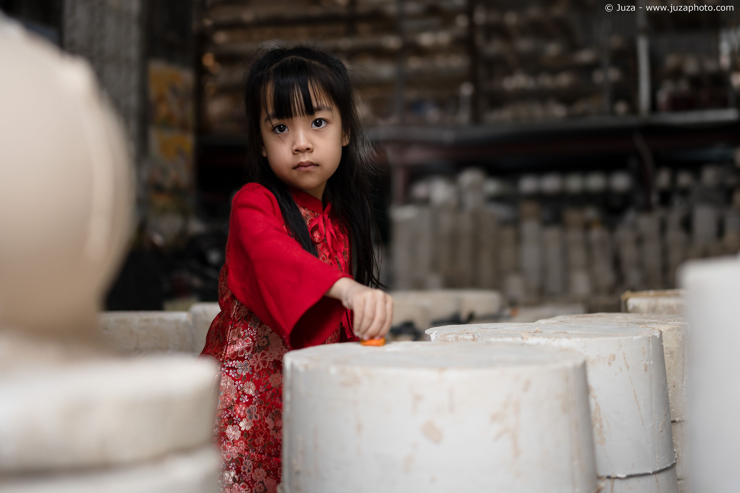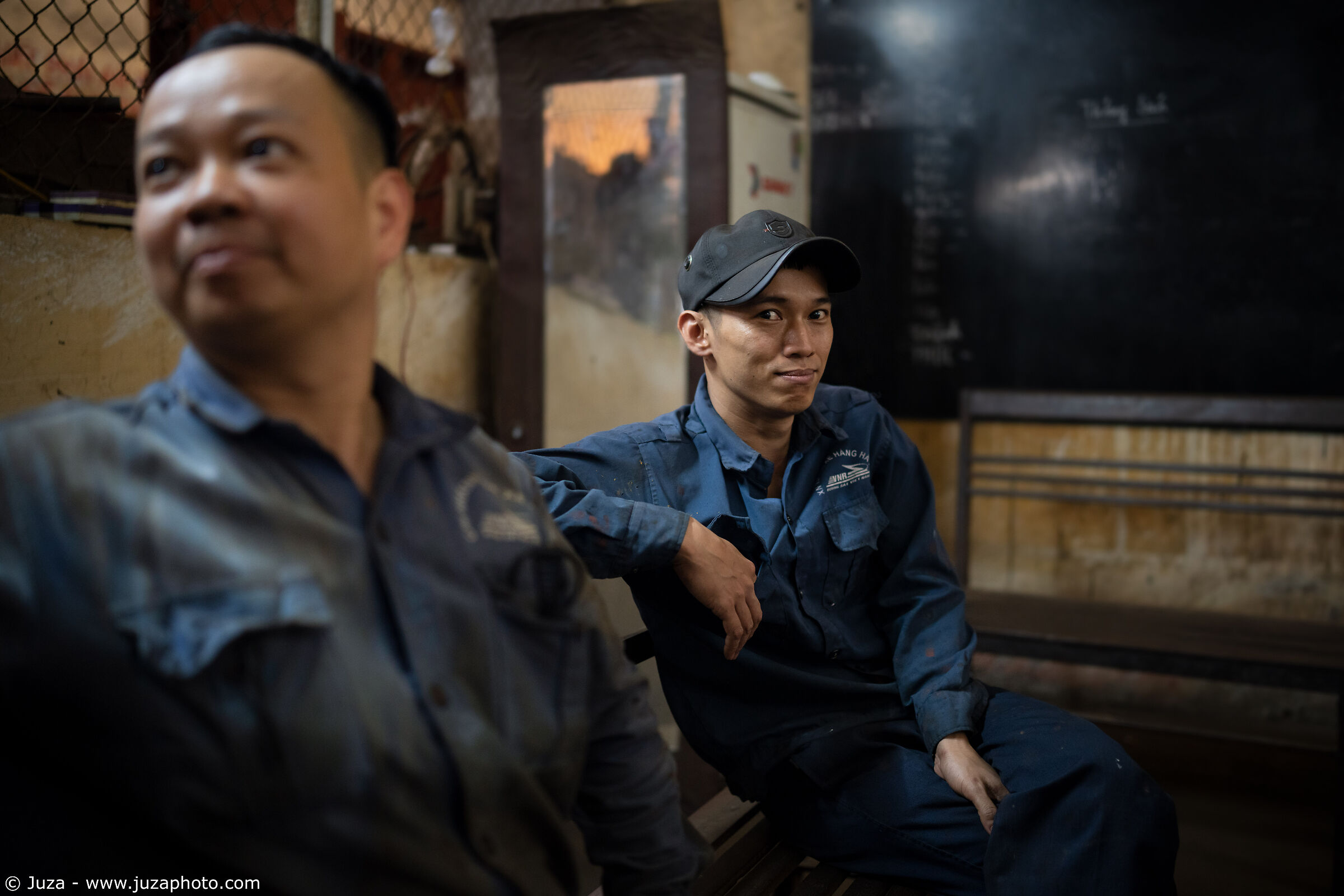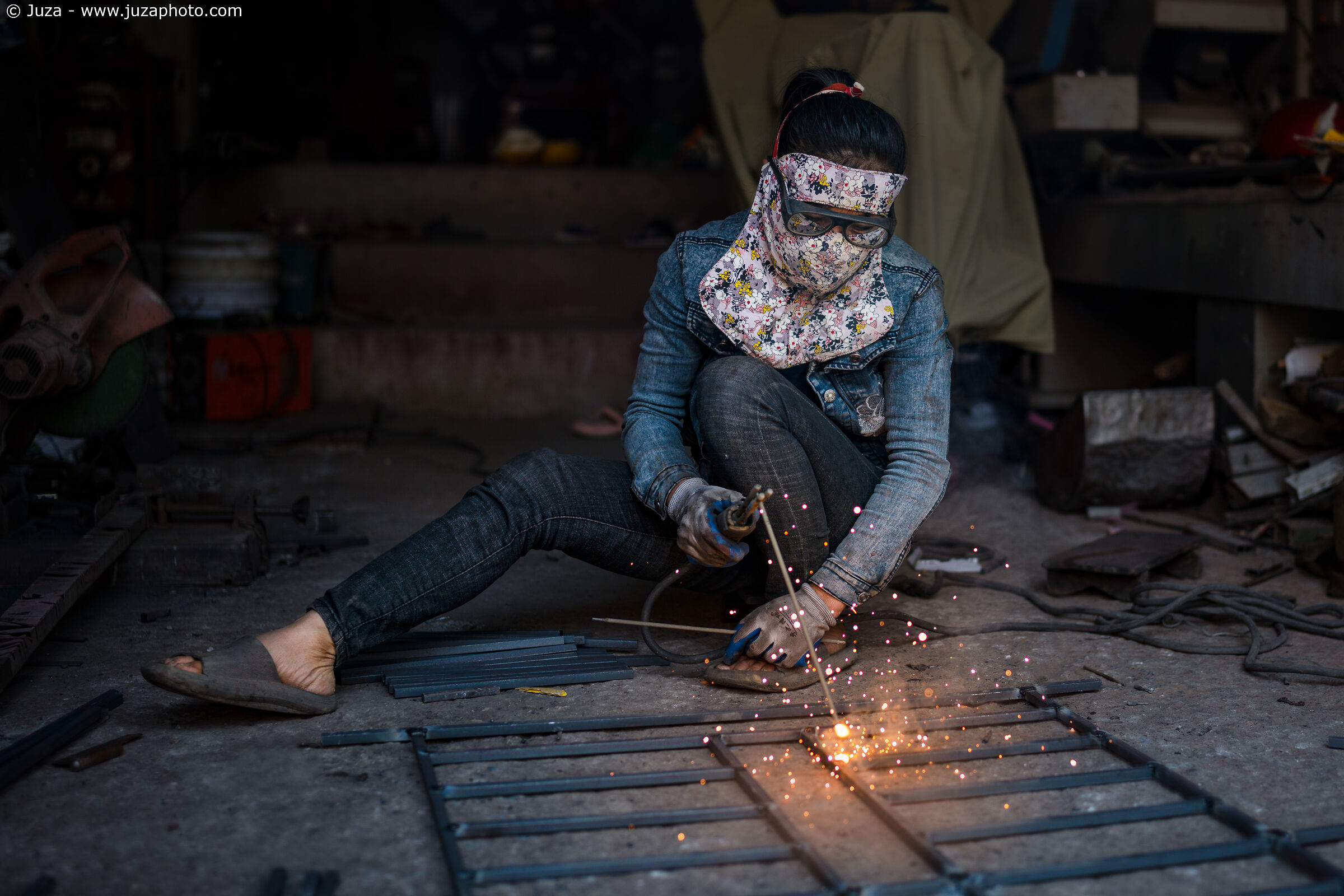 Arriviamo finalmente a Thu Sy e iniziamo l'esplorazione del dedalo di viuzze, prima tutti assieme e poi ciascuno per conto proprio. Una ragazza a lato della strada sta saldando del metallo, col volto protetta solo da una maschera di tessuto e occhiali alla buona. Ad ogni lampo le scintille volano nell'aria come piccoli fuochi d'artificio: sono affascinato e mi avvicino, fino a sedermi di fronte a lei. Col grandangolo 35mm bisogna stare parecchio vicini: si entra nella scena, con tutti i pro e contro del caso. Cerco di evitare la luce accecante ma resto lì, a costo di beccarmi le scintille... un lampo, due, tre, e alla fine riesco a cogliere l'attimo che cercavo. Alex mi ha insegnato a salutare in vietnamita: "cam on" (per ricordarsi, si può pensare all'inglese "come on"), così saluto e riprendo la camminata.