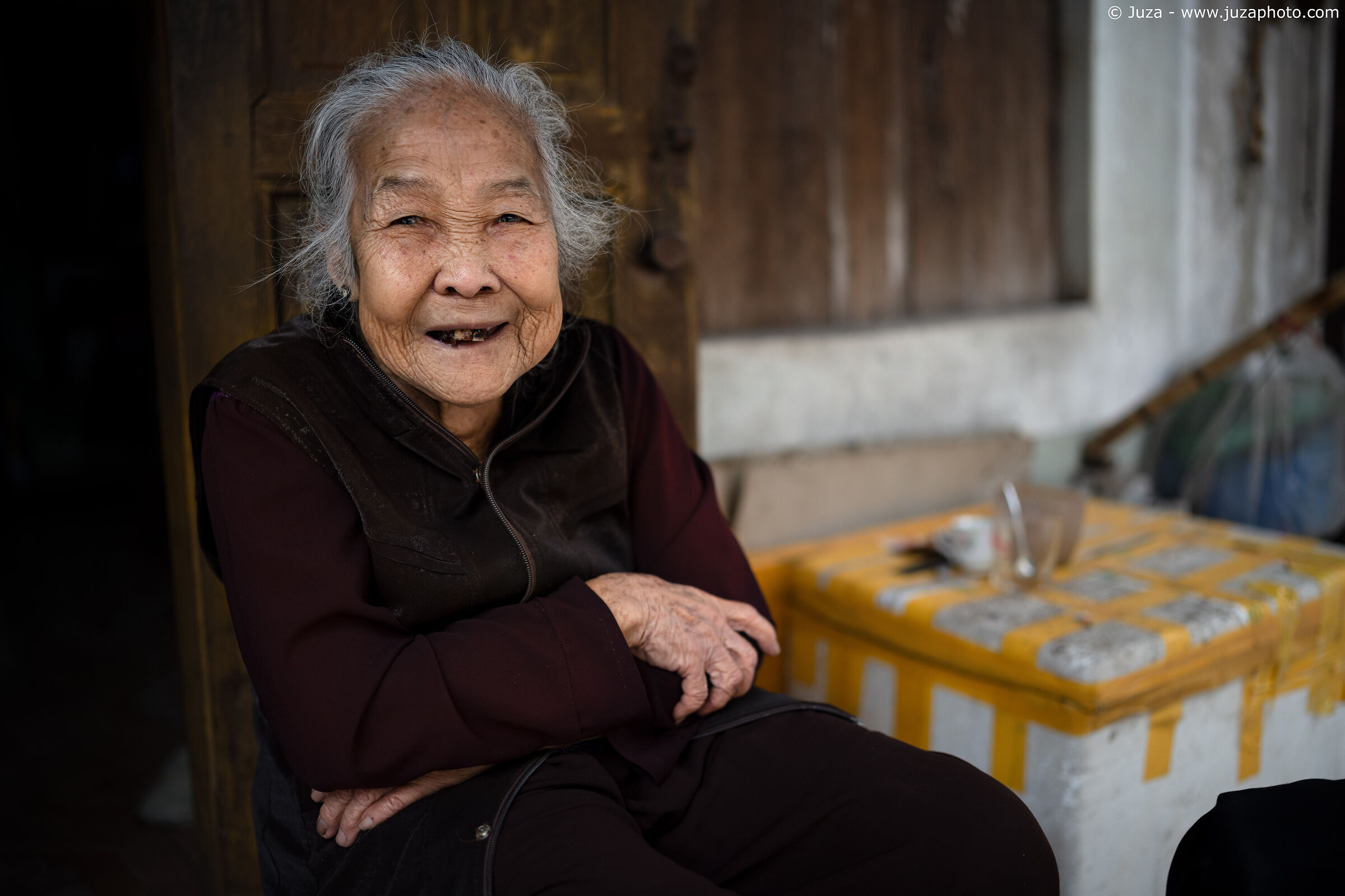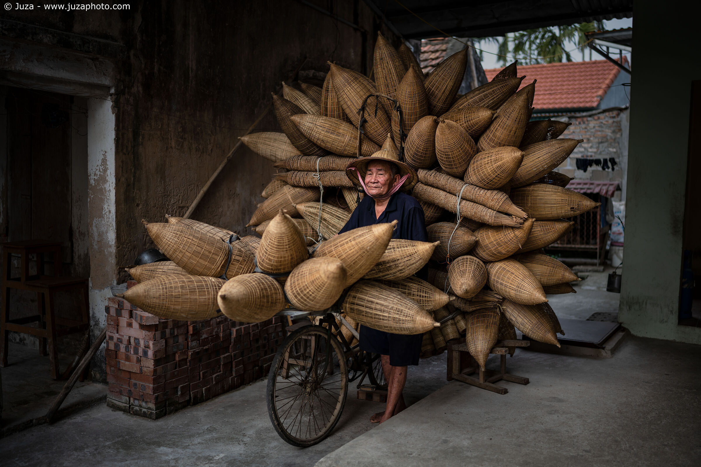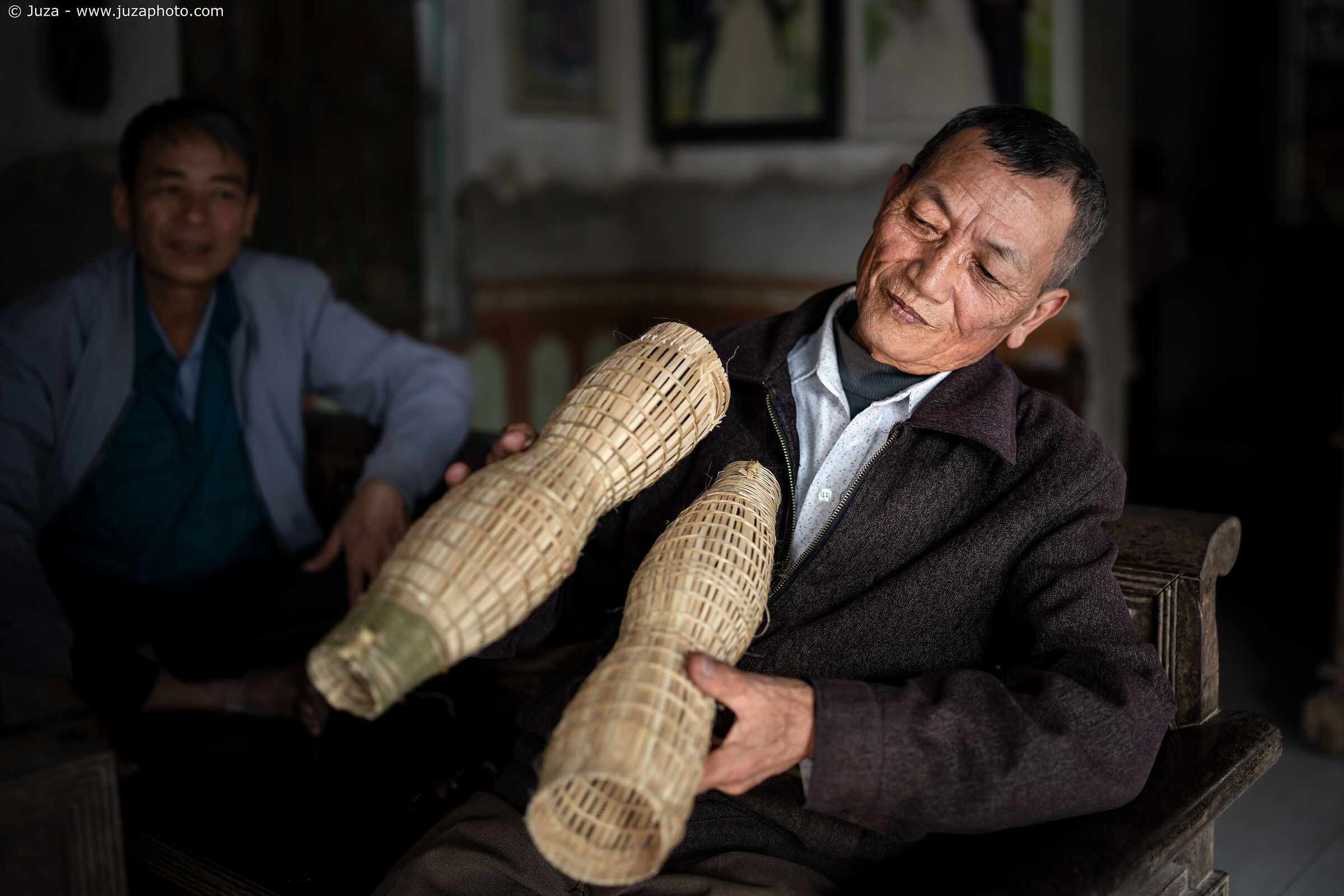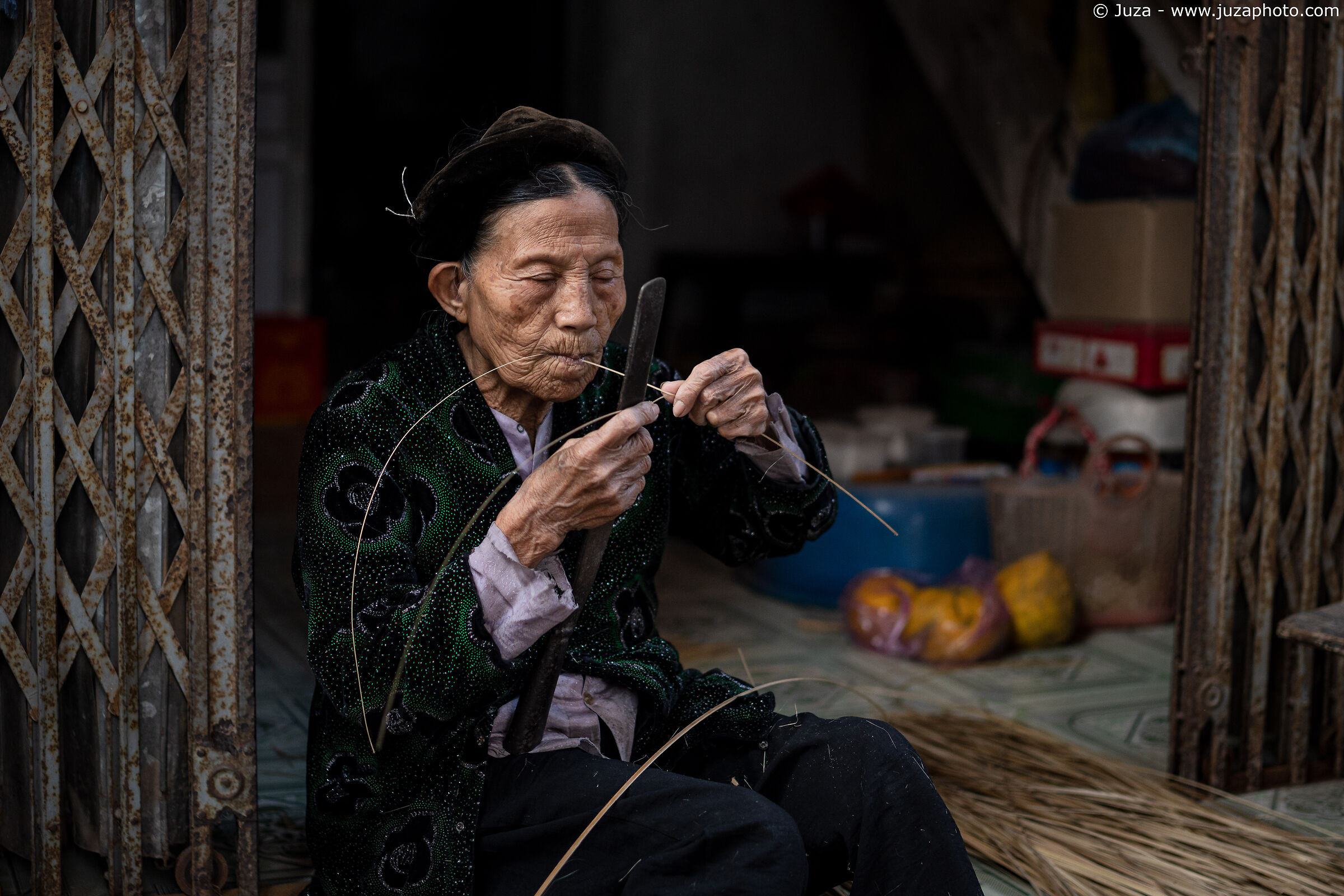 Poco dopo, proseguendo il mio cammino con Sony alla mano, vengo fermato da una signora che mi fa cenno di seguirla e mi porta da uno degli artigiani più noti del villaggio: quest'uomo ha fatto della lavorazione delle nasse l'impresa di tutta la sua famiglia; quando arrivo sta lavorando assieme a due anziane signore, mentre una vivace bimba di qualche anno zampetta avanti e indietro. L'anziano artigiano, unendo l'antico lavoro con un po' di moderna furbizia, ha trasformato il cortile in una pittoresca esposizione delle sue opere, assieme a una bicicletta parcheggiata di lato dove mostra come vengono trasportate le trappole (caricando all'inverosimile la bicicletta, versione antica degli attuali motorini cargo che si vedono ovunque in Vietnam).