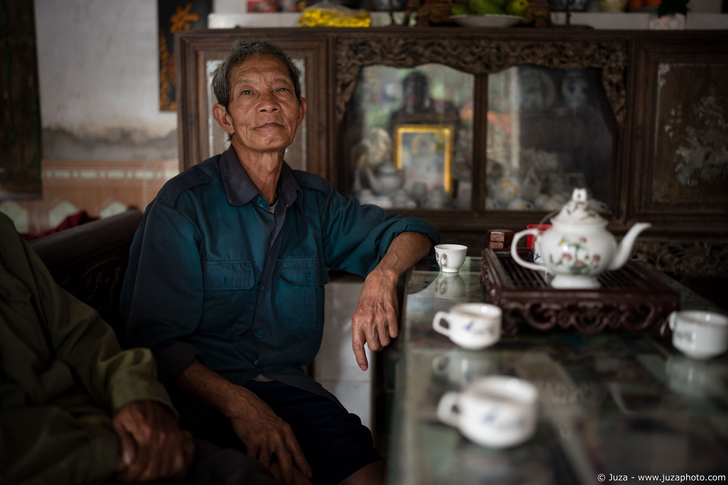Chiede l'equivalente di qualche euro per farsi fotografare; è il primo nel villaggio che chiede un compenso, ma tutto sommato penso sia una richiesta più che legittima visto il piccolo museo che si è prodigato di costruire, e così facendo riesce integrare il guadagno del suo lavoro. Alla fine, non tanto per filantropia quanto per mia imbranataggine nel contare i dong, finisco per dargli ben più di quanto richiesto, per la gioia dei presenti - una delle anziane signore mostra una delle banconote alla bimba, che la prende e saltella in giro come avesse un grande tesoro.