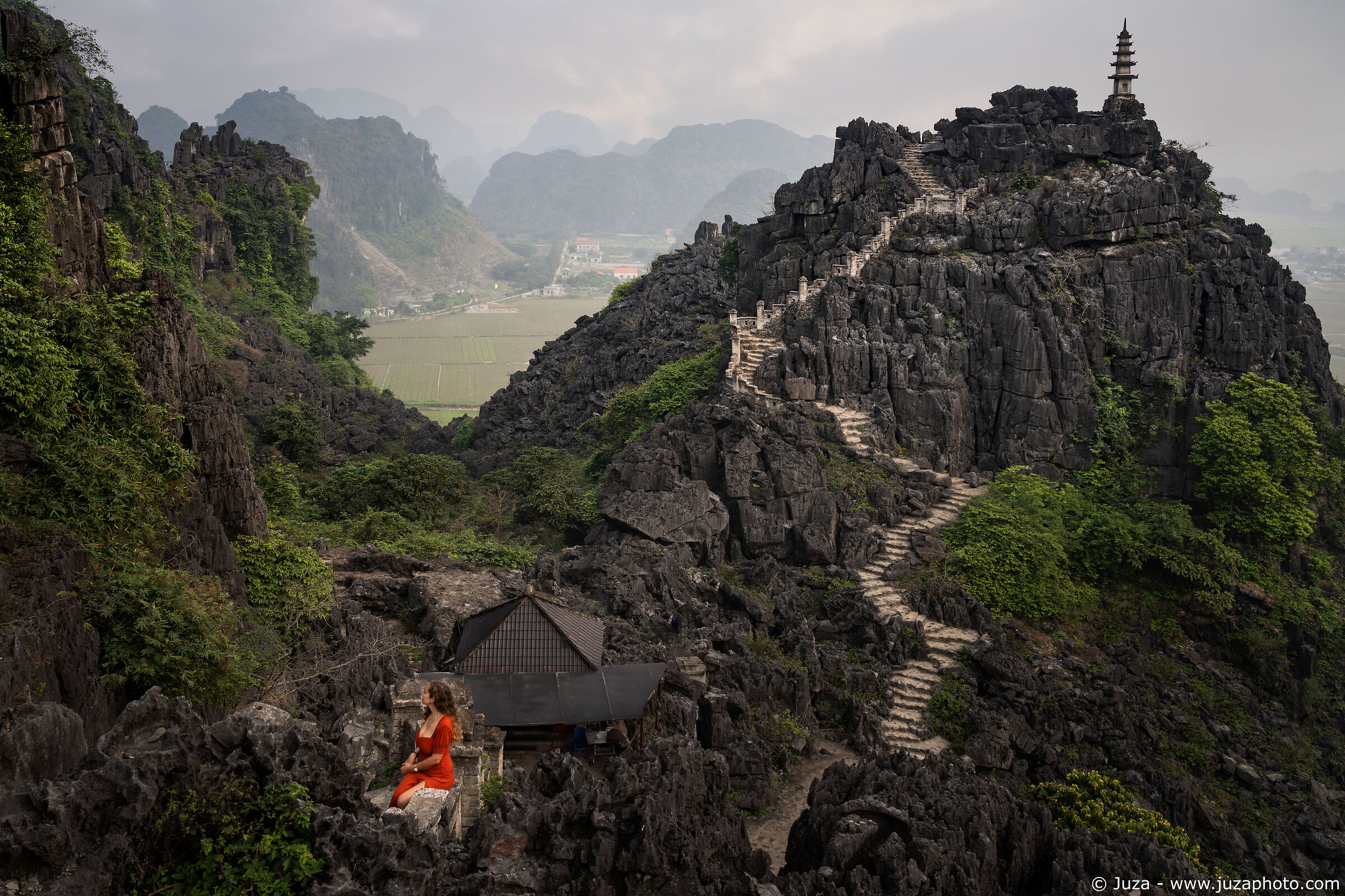 2 Marzo Sveglia alle cinque per raggiungere la cima di uno dei vicini monti, dove c'è il famoso Hang Mua, un punto panoramico sulle campagne circostanti. Le informazioni che avevo trovato si dimostrano (ancora una volta) sbagliate: c'è sì un cancello per arrivare alla salita di 500 scalini che porta in vetta, ma alle cinque e mezza è già aperta e la guardia mi fa entrare. Chi aveva descritto le tempistiche non doveva essere molto in forma: arrivo in vetta in poco più di dieci minuti invece dei quaranta previsti. La vista sarebbe notevole, ma l'onnipresente foschia non dà molte opportunità fotografiche, anche se con un po' di fortuna riesco comunque a portare a casa una foto: una ragazza con un vestito rosso mi passa davanti ed entra nell'inquadratura (cosa che abitualmente fa il mio amico Riaz, come saprà chi ha seguito le mie avventure negli anni passati; ogni tanto l'ho sfruttato come elemento umano nella composizione, e ogni tanto gli ho tirato un po' di accidenti). In questo caso però l'intrusione è certamente benvenuta, e aggiunge uno sfavillante tocco di colore in una scena che sarebbe altrimenti dominata da ben poche tonalità, grigio in primis.