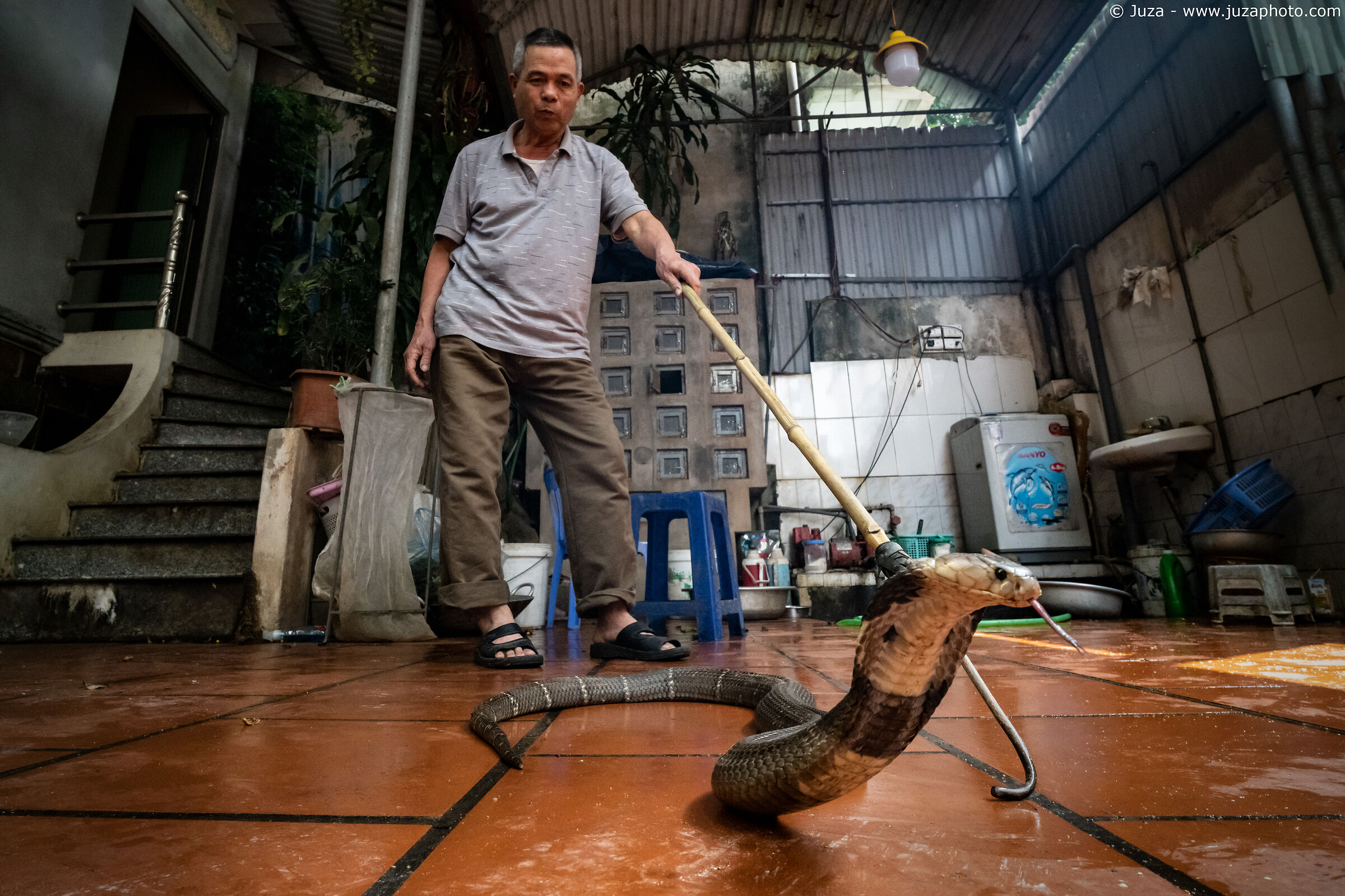 Salutiamo Ann, la ragazza della reception con cui ormai siamo entrati in amicizia, e ci avviamo verso il villaggio, o meglio il quartiere di Le Mat. Hanoi, crescendo a dismisura, ha finito per inglobare i villaggi circostanti. Qui allevano serpenti, e in particolare cobra, che come potete immaginare finiscono poi nel piatto: dopo un po' di ricerche, incontriamo uno degli allevatori, una piccola impresa di famiglia con qualche decina di serpenti. Questi vengono tenuti in una serie di loculi disposti "ad alveare" su una parete; l'uomo ci mostra un paio di cobra, sguinzagliandoli sul pavimento. Fa impressione averli così vicini, vederli che si rizzano e mi fischiano contro, mentre cerco di fotografarli da pochi centimetri con l'obiettivo 18mm. Con grande destrezza, il proprietario li maneggia e li blocca con un bastone prima che riescano ad attaccare e mordermi: può tardi ci racconterà che in vita sua è stato morso due volte, la prima quando aveva 25 anni, e ancora adesso (che è sulla sessantina) ha le cicatrici sulle mani dovute all'azione distruttiva del veleno... e gli è andata bene.