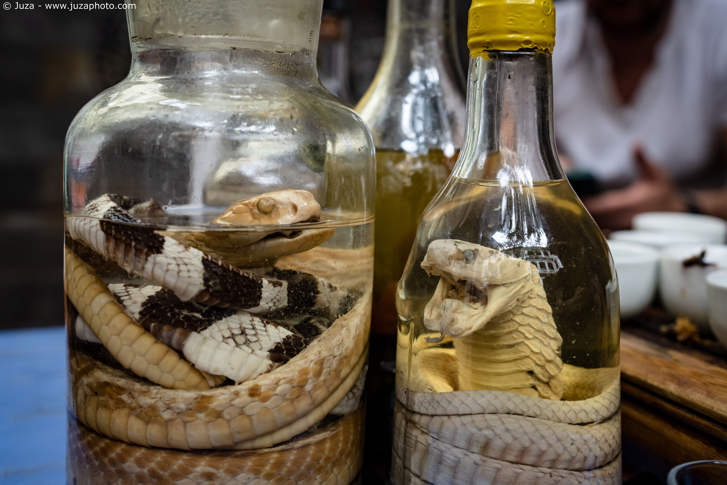 Oltre ad essere cucinati, i serpenti vengono anche immersi in alcohol per farne una sorta di liquore; ci fanno sedere e portano a tavola varie bottiglie con liquidi giallastri in cui sono immersi cobra e altri serpenti. Mi lascio andare e li assaggio tutti; il sapore va da una sorta di grappa a un altro che ha un sapore simile alla frutta candita, in versione pesantemente alcolica (grazie al traduttore, ho poi scoperto che oltre al serpente immerso conteneva bile e sangue di serpente).