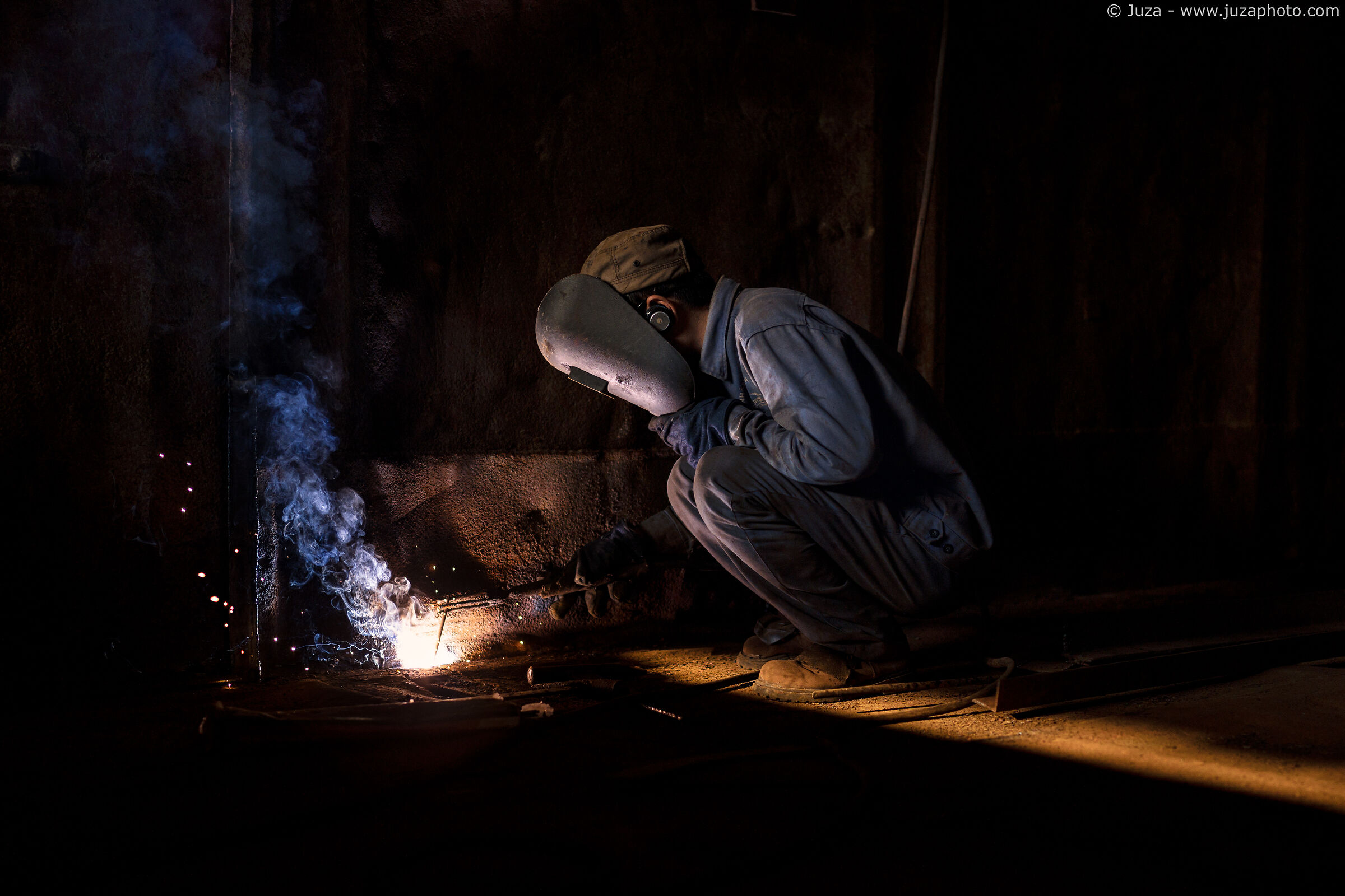 Iniziamo a girare a caso tra le vie del paese, dividendoci in due gruppi: Alex e Dani finiranno per fermarsi a giocare a pallone con dei ragazzi locali, mentre io e il Dom seguiamo i binari della ferrovia (che qui sono del tutto aperti, si possono attraversare ovunque, facendo solo attenzione a non farsi mettere sotto). Arriviamo in un cantiere ferroviario dove vengono riparati i vecchi treni: proviamo ad entrare e ancora una volta veniamo accolti con enorme ospitalità... provate a fare una cosa del genere in Italia; vi urlerebbero contro e dopo due minuti chiamerebbero la sicurezza per buttarvi fuori. Qui invece ci sorridono e ci lasciano girare liberamente, e avvicinarci finché vogliamo, al punto che per fotografare un saldatore standogli a fianco mi becco un po' di scintille sulla pelle. Mi affascina tantissimo l'esplosione di scintille nel buio; è ipnotizzante, surreale, ancora di più in un posto come questo dove si mischia ai colori e odori esotici.