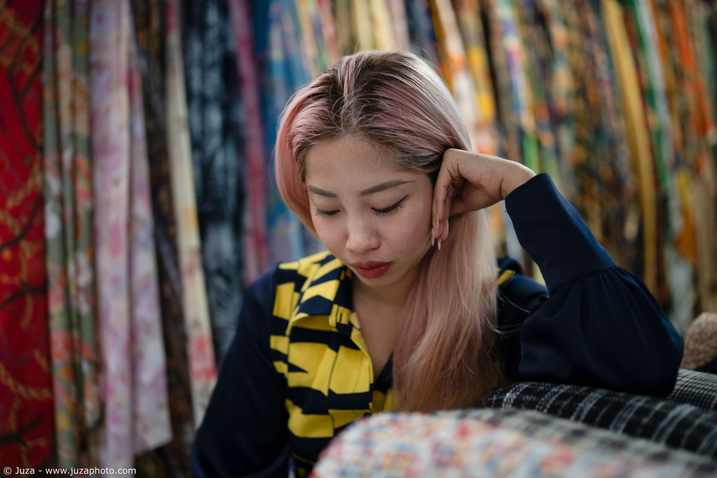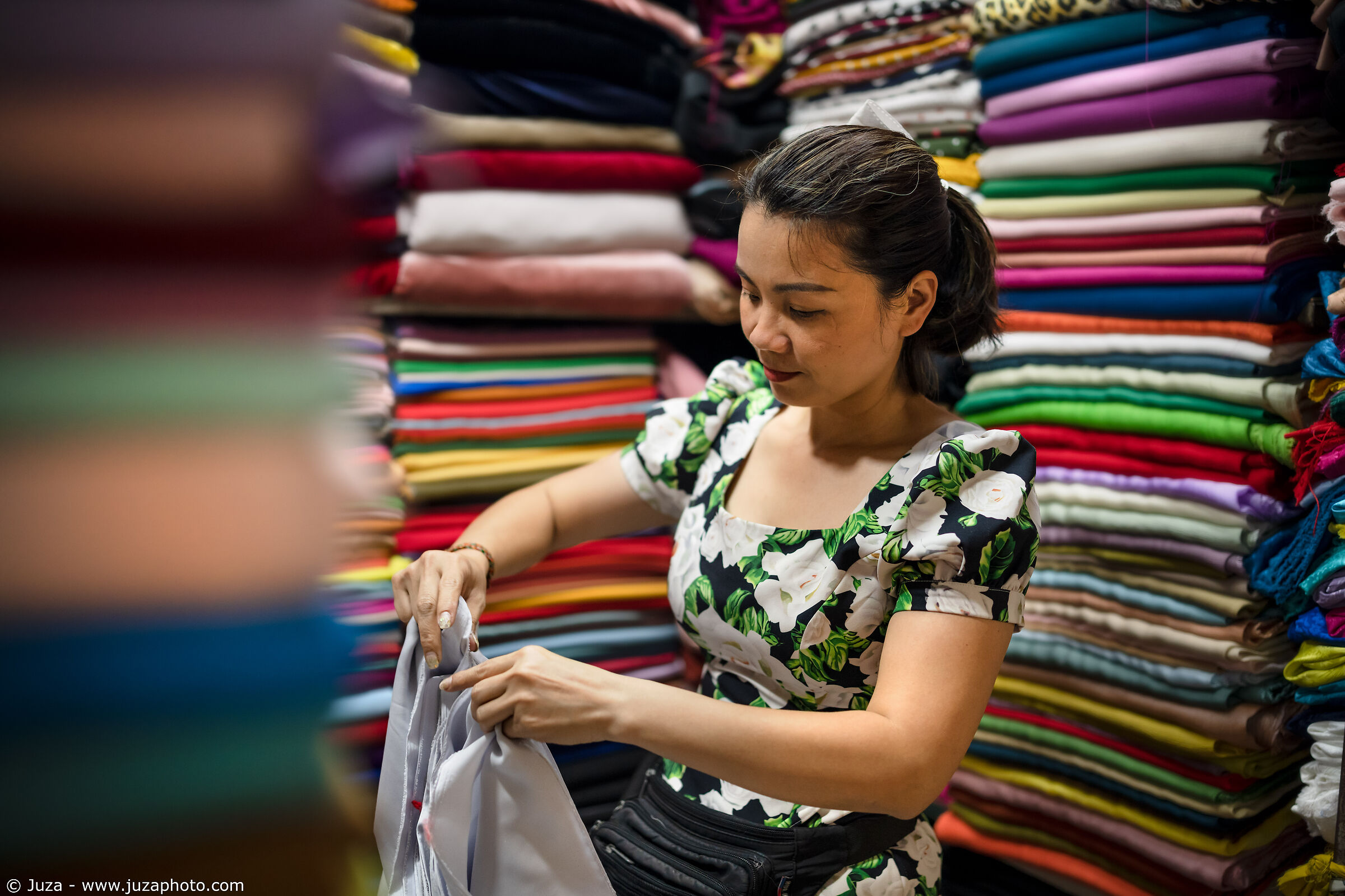 Uscendo dal centro, attraverso il quartiere dei tessuti: qui si trova un enorme mercato che vende tessuti di tutti i tipi e colori, oltre a un'infinità di negozietti di abbigliamento. Il mercato è un labirinto di minuscoli loculi di circa 2 metri x 2 metri, stipati all'inverosimile di tessuti appoggiati uno sopra l'altro, con la proprietaria "incastrata" in mezzo, talvolta seduta sui tessuti stessi. Dedico un'ora ad esplorare questa zona, entrando anche in una sartoria dove fotografo le ragazze al lavoro. Come al solito, la mia tattica quando trovo un posto interessante è semplicemente entrar dentro, sorridere e fotografare; se non mi cacciano ne possono uscire foto interessanti, e ogni tanto anche qualche amicizia in più.
