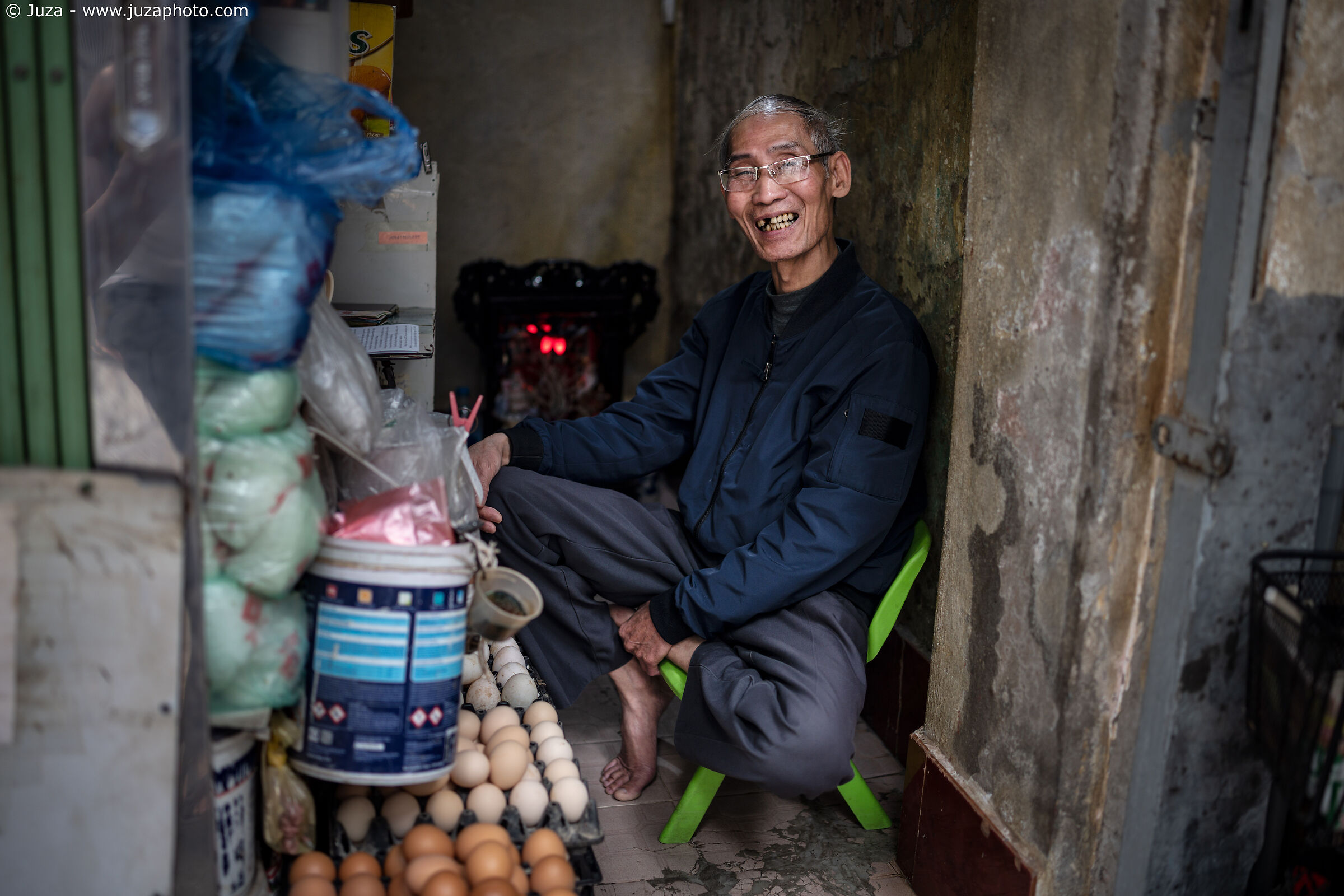 Tra i tanti incontri, uno che mi è rimasto nel cuore è l'allegro venditore di uova: aveva una celletta così stretta che malapena riusciva a starci seduto sul suo minuscolo sgabello; in fondo aveva costruito un tempietto (questi piccoli altari sono molto frequenti sia nelle case che nei negozi e alberghi), mentre di lato c'erano le uova in vendita, e un po' di altra merce disposta disordinatamente in sacchetti e secchi. Gli ho scattato qualche foto e quando ha incrociato il mio sguardo, mi ha sorriso con un bonario calore, un sorriso che trasmetteva un calore paterno, come un abbraccio. Sono felice che quel ricordo viva ancora nelle foto che ho scattato.
