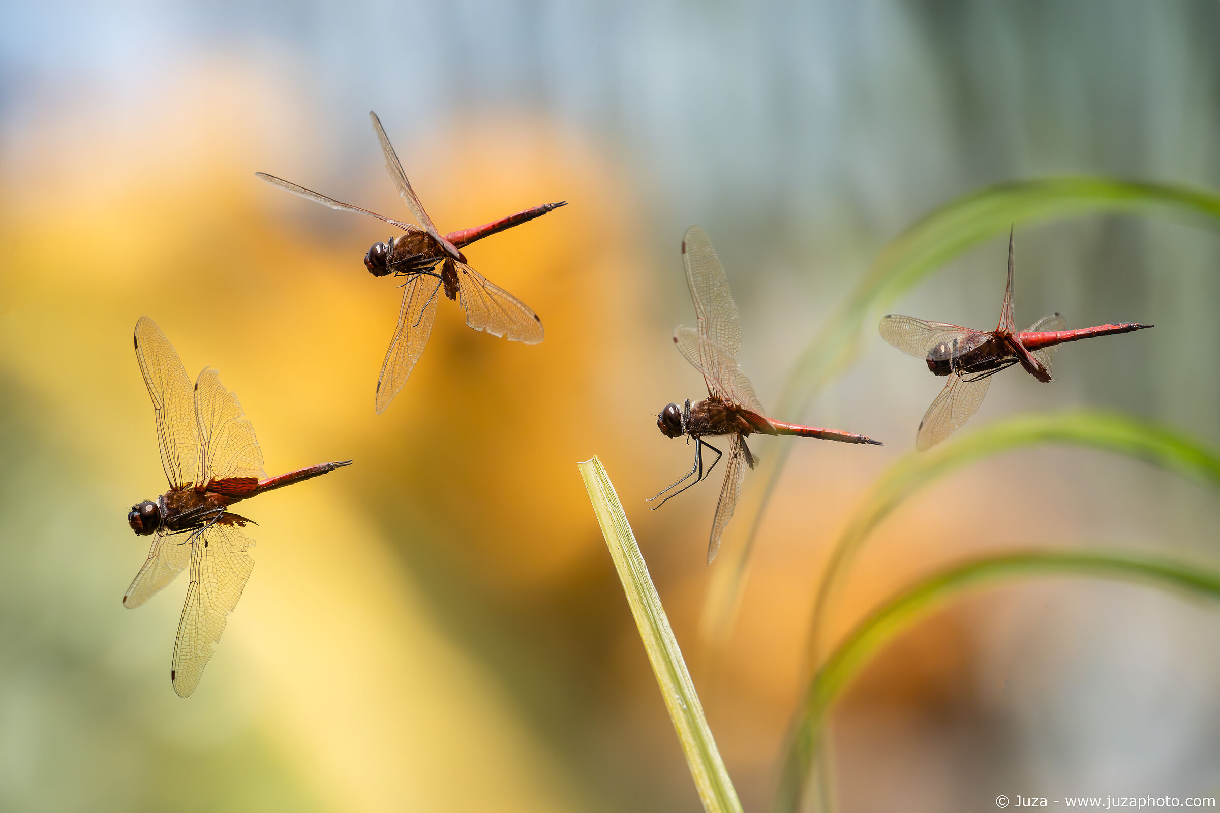 Sony A9 III, Sony FE 200-600mm f/5.6-6.3 G OSS con Sony FE 1.4x, 1/8000 f/9.0, ISO 6400, mano libera. I movimenti della libellula sono così rapidi che mi son reso conto che anche a 60 FPS perdevo molto scene: ho così scattato alla velocità massima, 120 FPS. Questa velocità estrema mi ha permesso di realizzare l'immagine che vedete (anche qui si tratta di quattro foto estratte dalla sequenza 120FPS); tuttavia, il buffer di soli 1.5s è molto limitante, e dopo ogni raffica di 1.5s bisogna attendere 10-12 secondi perchè questa venga registrata sulla CFExpress.