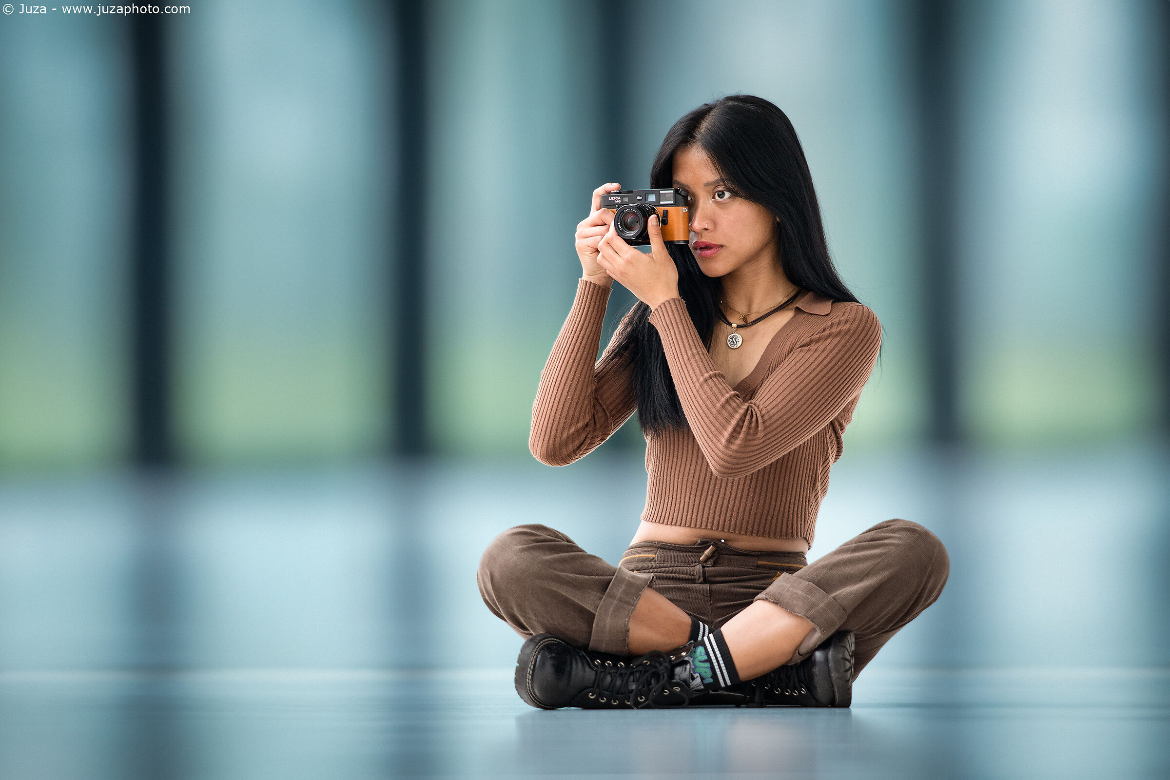 Così scelgo una Leica M6, con finitura tra il color pelle e l'arancione, dalla sconfinata collezione esposta nel museo Leica di Wetzlar; uno dei corpi preferiti dello sceicco, che ne fece realizzare un'edizione limitata con lo stesso colore e caratteristiche di quella che ho fotografato, ma con inciso il suo nome e una data: il 2006, lo stesso anno in cui fu realizzato il Leica 1600mm. La dò ad Azzahra e le chiedo di posare con questa, aiutato anche da Liam che fa un po' di avanti e indietro per riferire le pose: per alcune foto arrivo a scattare da una distanza di circa 100 metri; decisamente impegnativo comunicare con la modella.