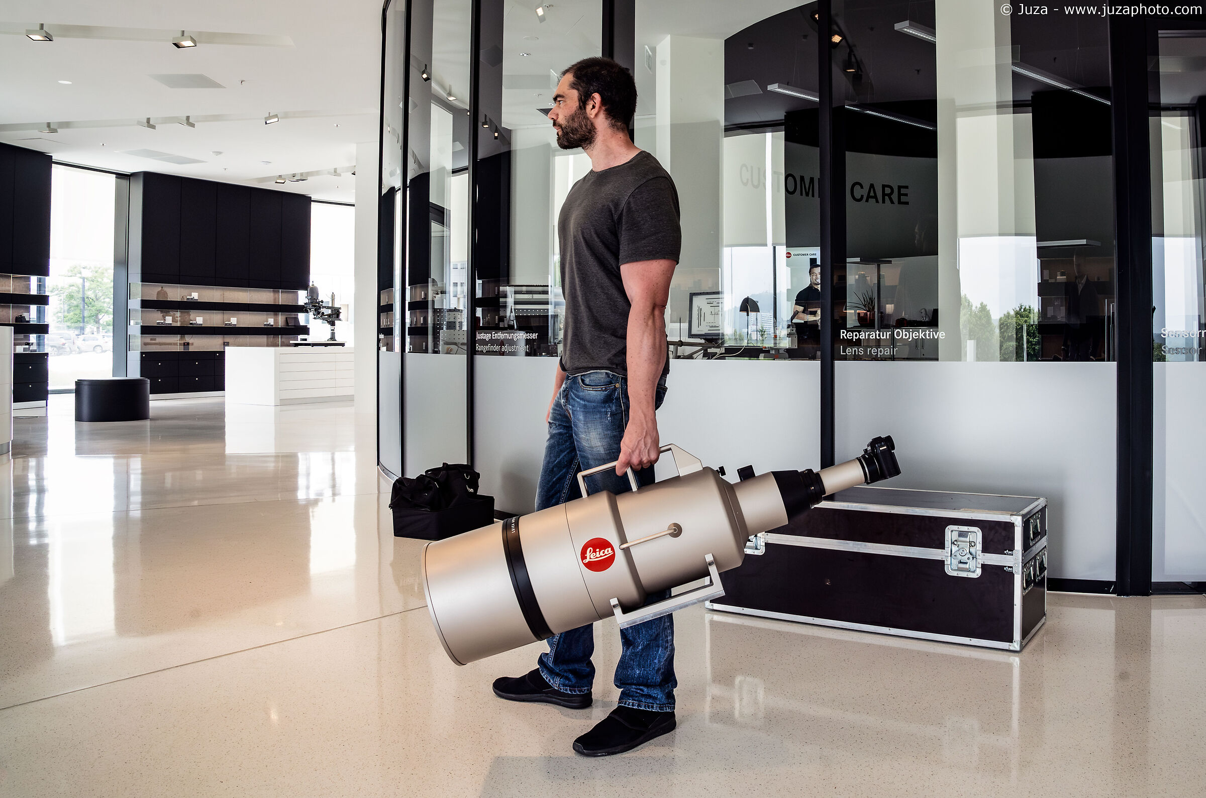 Il primo incontro col Leica 1600mm è attraverso un vetro. Wow. "I thought that the Sigma 200-500 2.8 was big, but this one is really next level", dico a Liam. E' impressionante: per quanto possa far colpo in foto, vederlo dal vivo, con la sua enorme massa di metallo, fa un altro effetto. Provo a sollevarlo, e con sorpresa nonostante il peso (45kg, il triplo del Sigma) riesco comunque a maneggiarlo. Sarei quasi tentato di provare la classica posa da "scatto a mano libera", ma il rischio che la baionetta della fotocamera si spezzi è elevatissimo, seguita subito dopo dalla mia schiena, per poi concludere con due milioni di euro che si sfracellano per terra. Meglio non provare, questa volta.