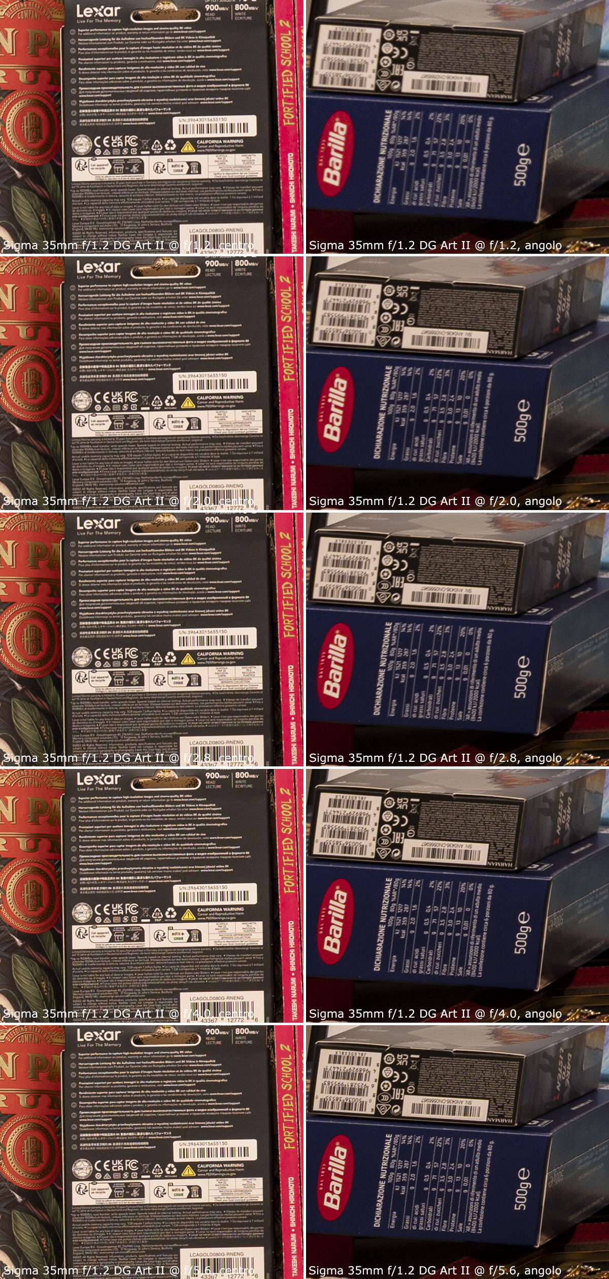 Vediamo come sempre i ritagli al 100% dal file RAW, osservando angolo e centro ai principali diaframmi.