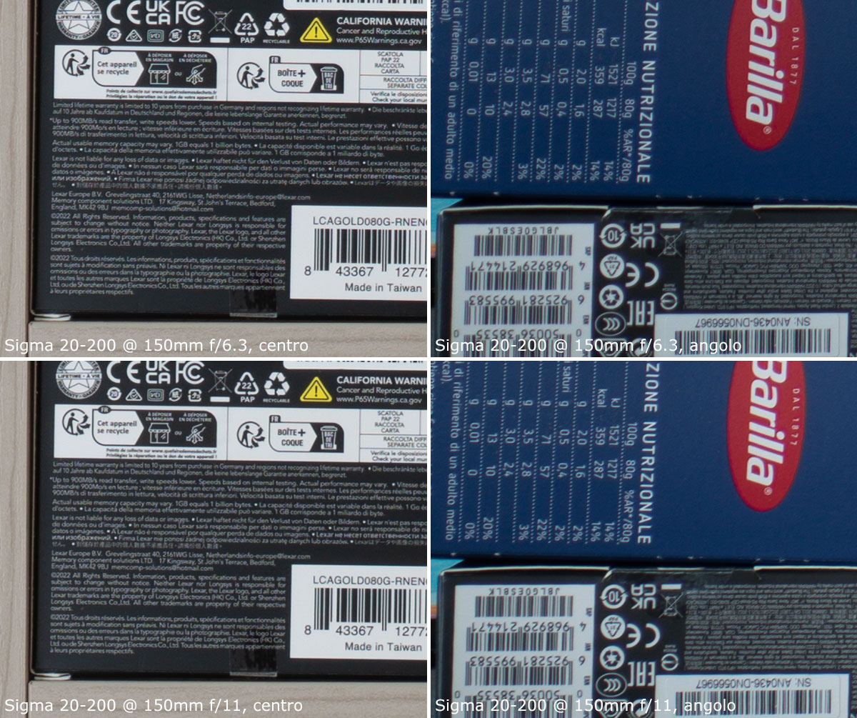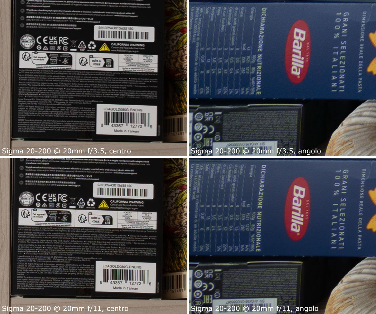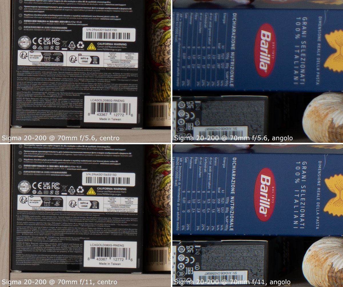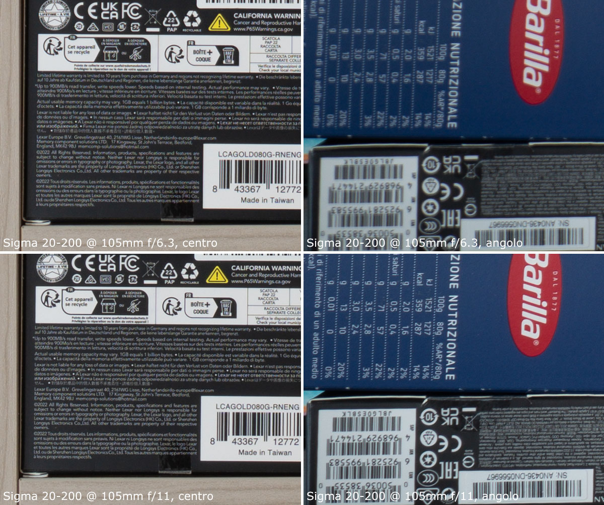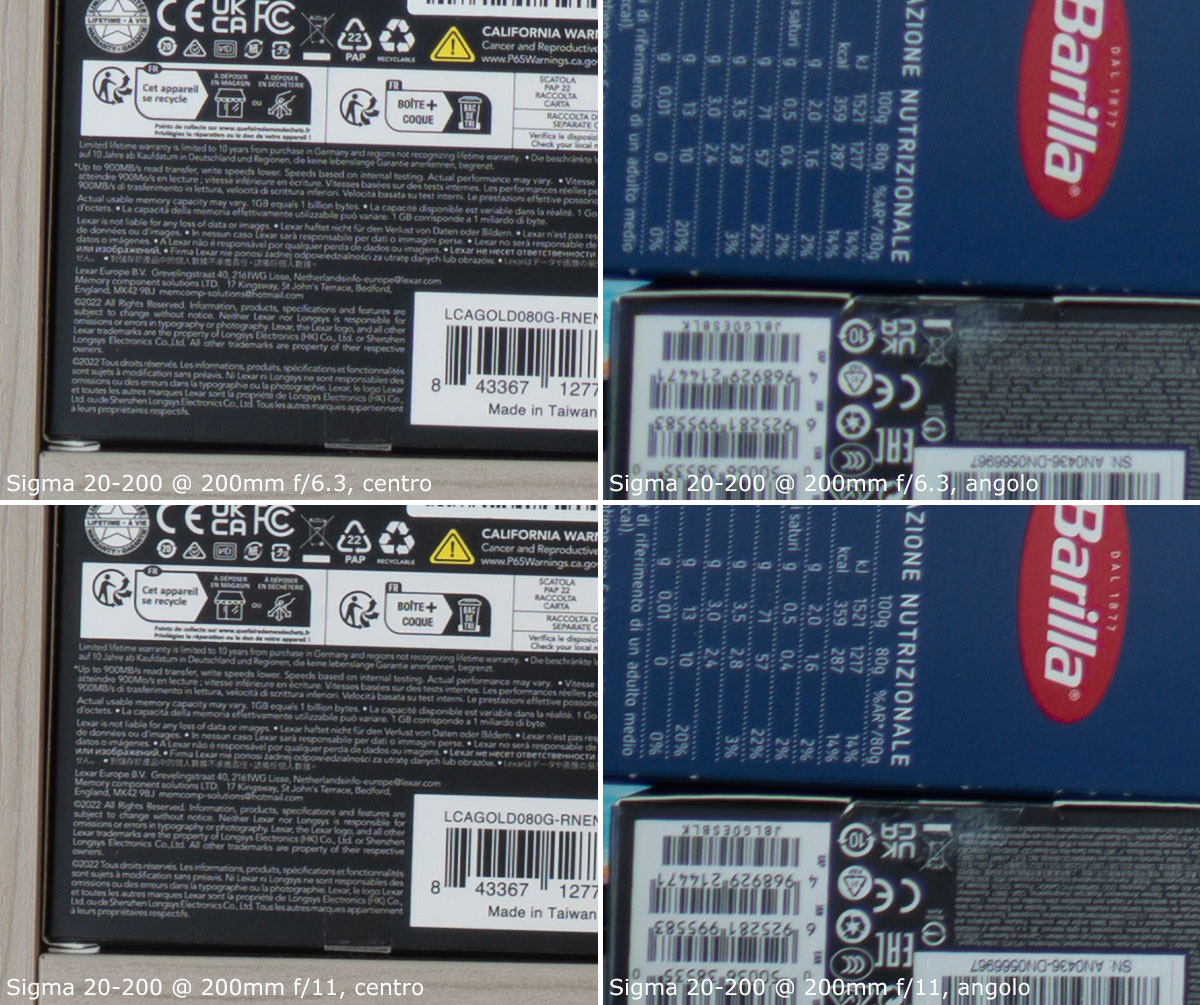 A 200mm, il centro è molto buono già a tutta apertura; gli angoli invece sono poco nitidi a tutta apertura, e discreti chiudendo a f/11.