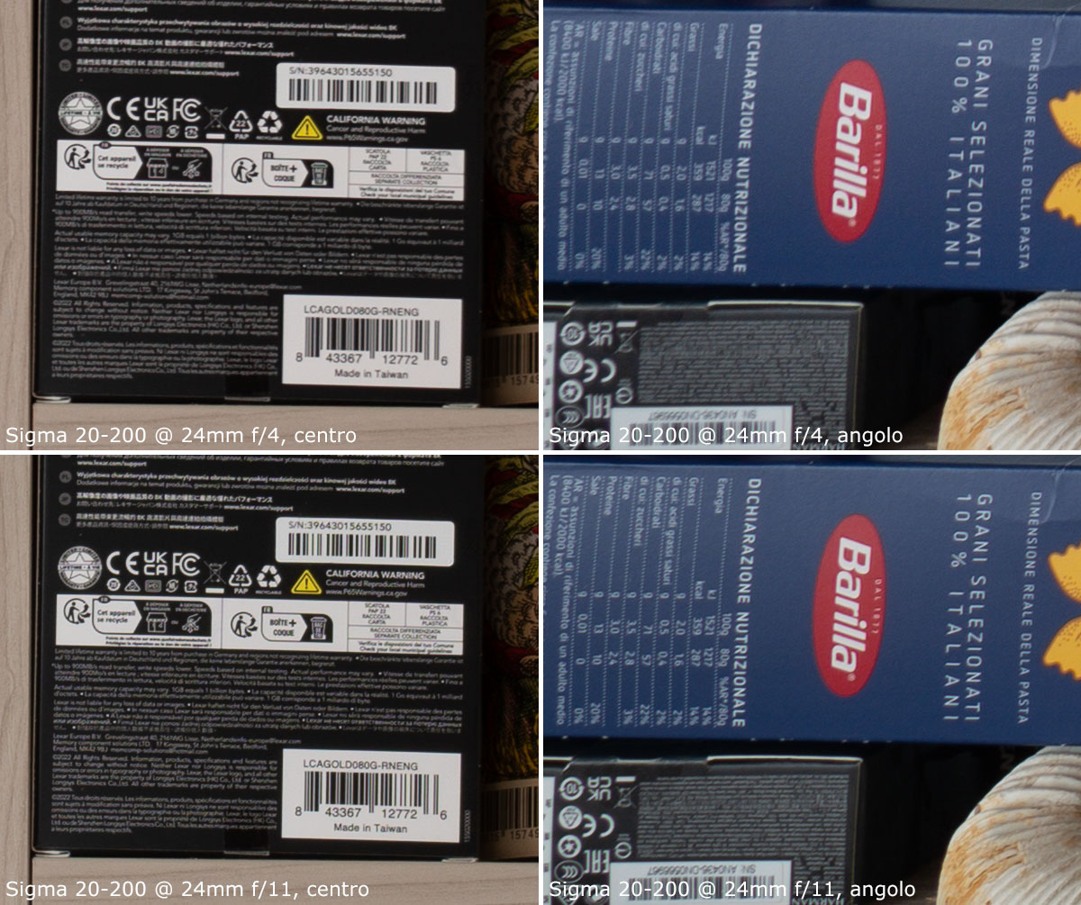 Anche in questo caso, abbiamo un centro sempre ottimo; gli angoli sono leggermente migliori rispetto alla focale 20mm, e chiudendo a f/11 c'è un miglioramento più marcato, anche se non si raggiunge mai una nitidezza perfetta.