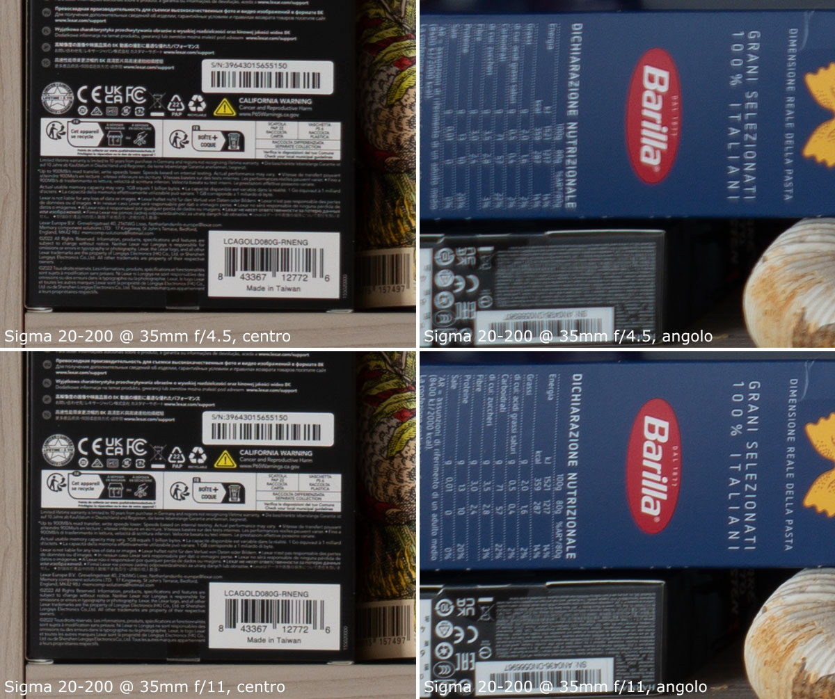 Sul centro continueremo a ripeterci: a tutte le focali è ottimo. La focale 35mm è invece quella più debole per quanto riguarda la resa negli angoli; a tutta apertura sono molto scarsi, anche se per fortuna chiudendo a f/11 c'è un netto miglioramento che permette di raggiungere una discreta qualità.