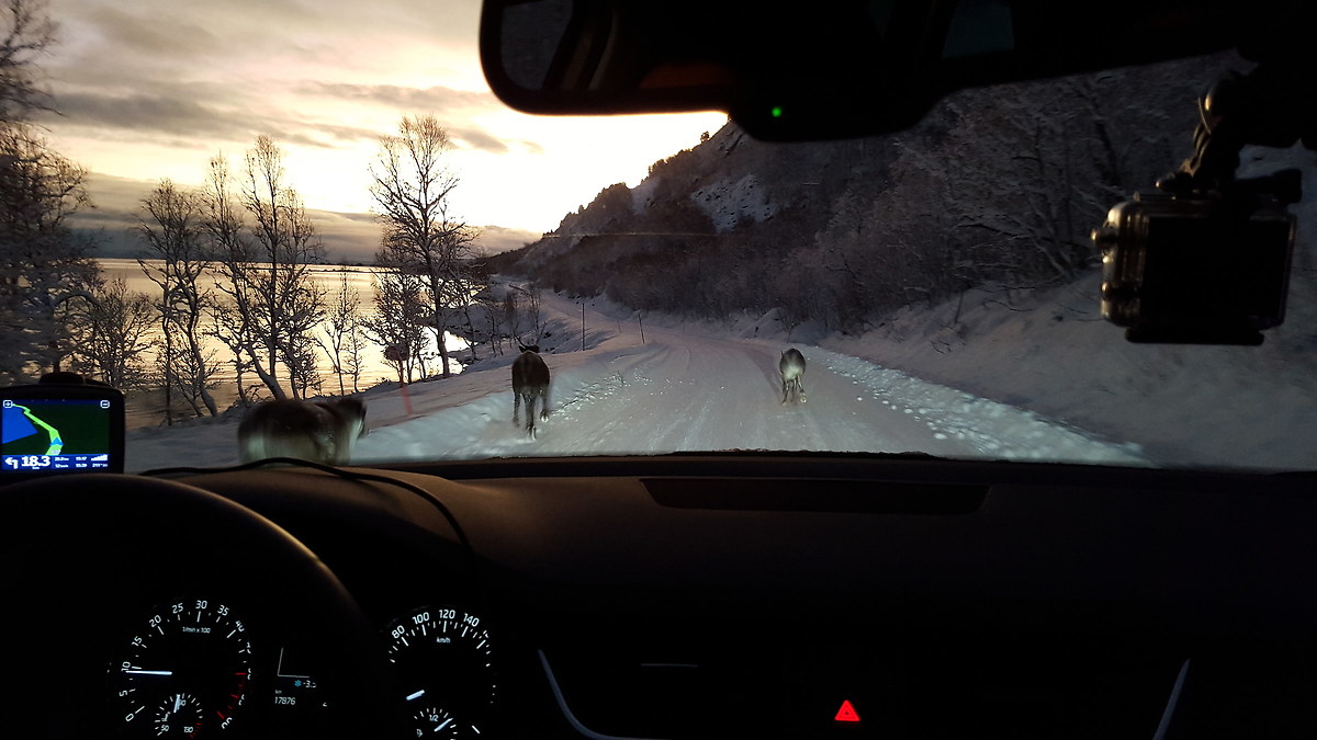 La notte è stata troppo breve , alle 9 siamo in piedi il tempo di farci una colazione prepararci e via di nuovo in macchina. Lungo la strada molte soste per fare foto ai vari scorci con un alcuni incontri ravvicinati: il primo con tre renne (che rivedremo poi dopo qualche ora) che ci attraversano la strada e poi corrono tra gli alberi. Dopo pochi metri ci fermiamo per delle foto e sentiamo degli spari ...momento di tristezza pensando che fossero di qualche cacciatore di renne, ma poi scopriamo che si tratta di due locali che fanno tiro al piattello.