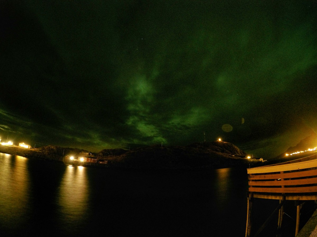 Il tempo è brutto decidiamo di fare un giro ad A comunque e di scattare qualche foto, compriamo gli ultimi rifornimenti per il nostro cenone di capodanno e poi ci rilassiamo nel rorbu...e poi magicamente appare lei, l'aurora fuori dal nostro rorbu in mezzo ad un cielo nuvoloso..