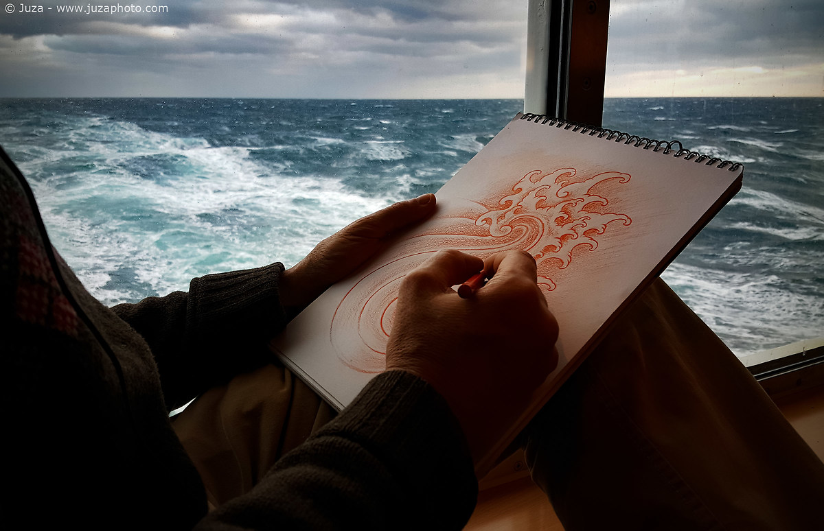 Ora dopo ora, ci addentriamo sempre più nell'oceano Atlantico; davanti alla finestra, il mio compagno di viaggio disegna e io scrivo; la fievole luce del giorno che filtrava dalle nuvole è già sparita a metà pomeriggio, e mentre nella nave le luci calde ci avvolgono sempre più, al di là del vetro il blu ha lasciato il posto a un buio profondissimo, senza luci di città, senza stelle nè luna, senza nessun rumore se non quello della nostra nave che attraversa i campi di onde.