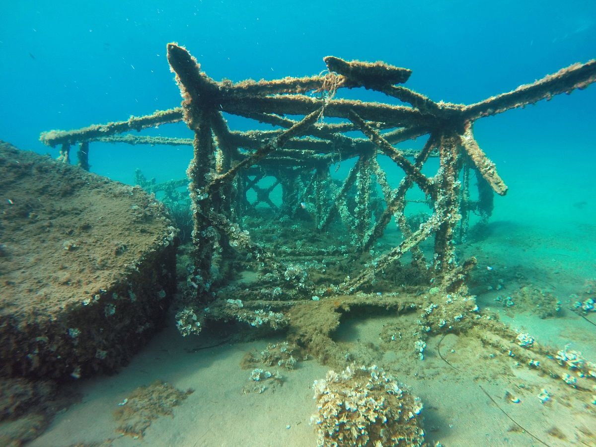 Spinti dalla curiosità sorta da chiacchiere con gente del luogo, riprendiamo il sentiero del giorno prima e arriviamo in pochi minuti all'ex cava di ferro, i cui tralicci, una volta dismessa la cava, sono stati fatti saltare e ora si trovano stesi sul fondale. Indossiamo quindi maschera pinne e boccaglio per andare a vedere come si presentano. In realtà il nostro obiettivo era quello di andare a vedere un'ancora di una vecchia nave da carico che doveva essere in zona ma ahimè non l'abbiamo trovata. Siamo rimasti comunque affascinati da come l'ambiente naturale si è adattato alla presenza di questi oggetti antropici e abbiamo trovato fiumane di pesciolini tra cui moltissime castagnole nere e numerosissime sogliole sul fondo.