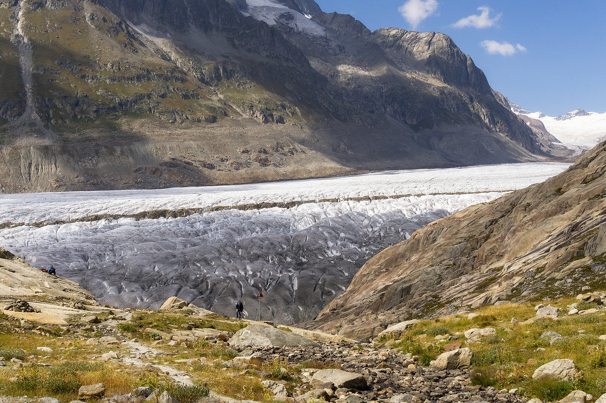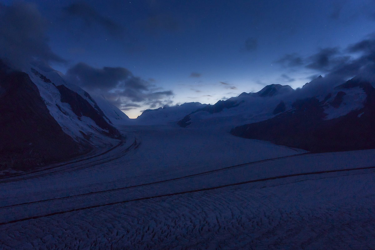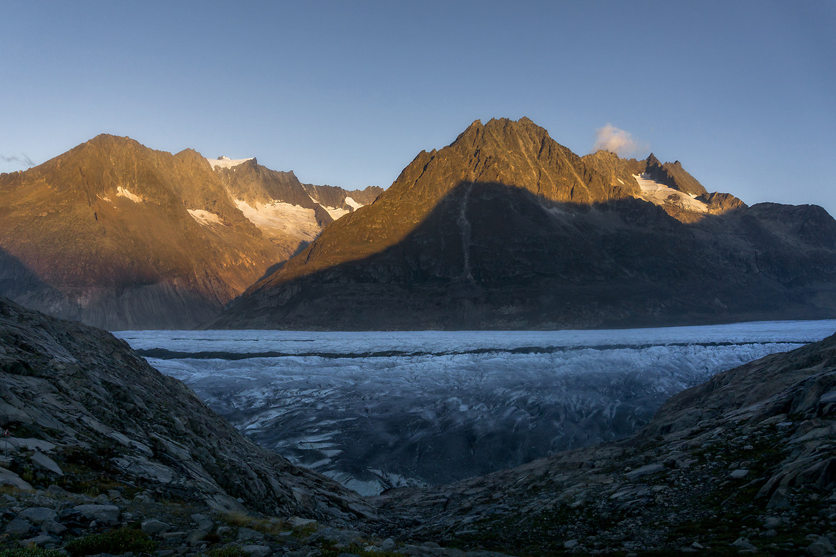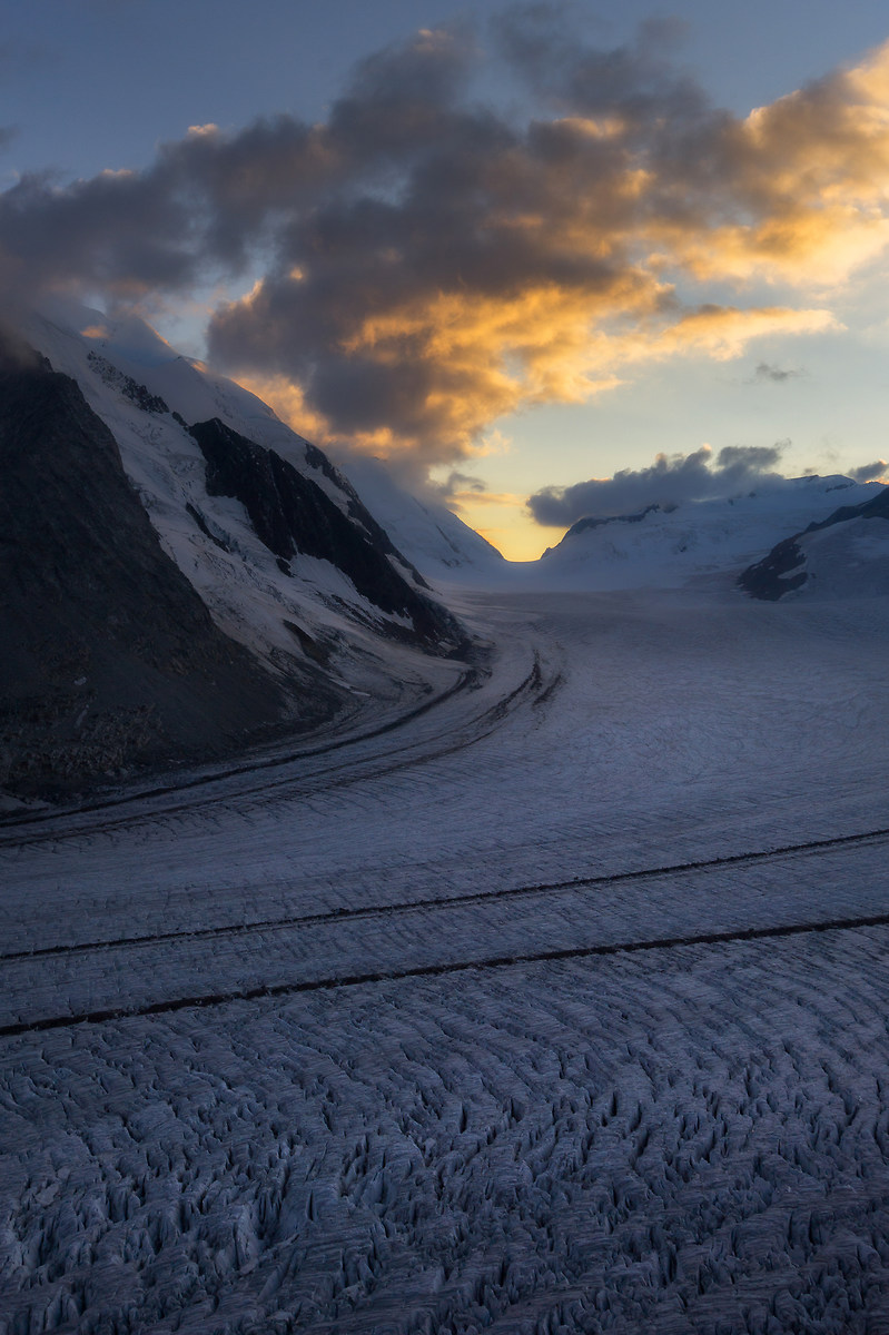 Dopo una quarantina di minuti di sentiero entriamo in una inquietante galleria pedonale lunga un chilometro, che ci proietta in un mondo decisamente più selvaggio e inaspettato. Siamo in vista del gigantesco Aletschgletscher, una lingua di ghiaccio lunga quasi venticinque chilometri e terribilmente larga - la più estesa di tutte le Alpi. Sicuramente una delle "cose" più immense su cui io abbia mai posato lo sguardo, o su cui abbia puntato la macchina fotografica. Lasciamo i sacchi a pelo sotto un grosso masso poco prima di mettere piede sul ghiacciaio, e poi lo percorriamo senza un vero percorso obbligato per svariate ore.