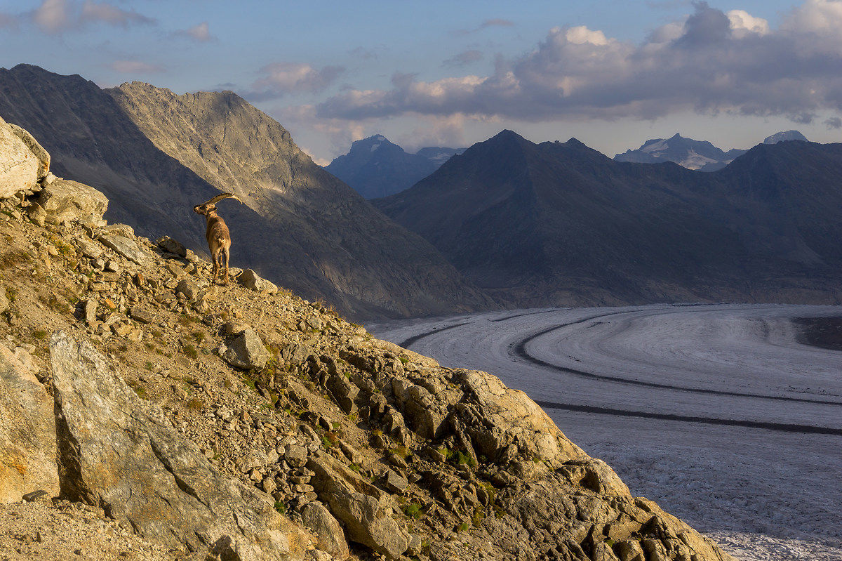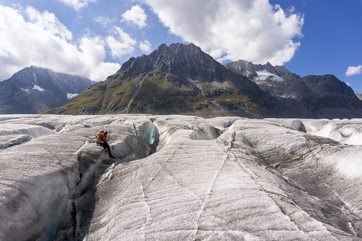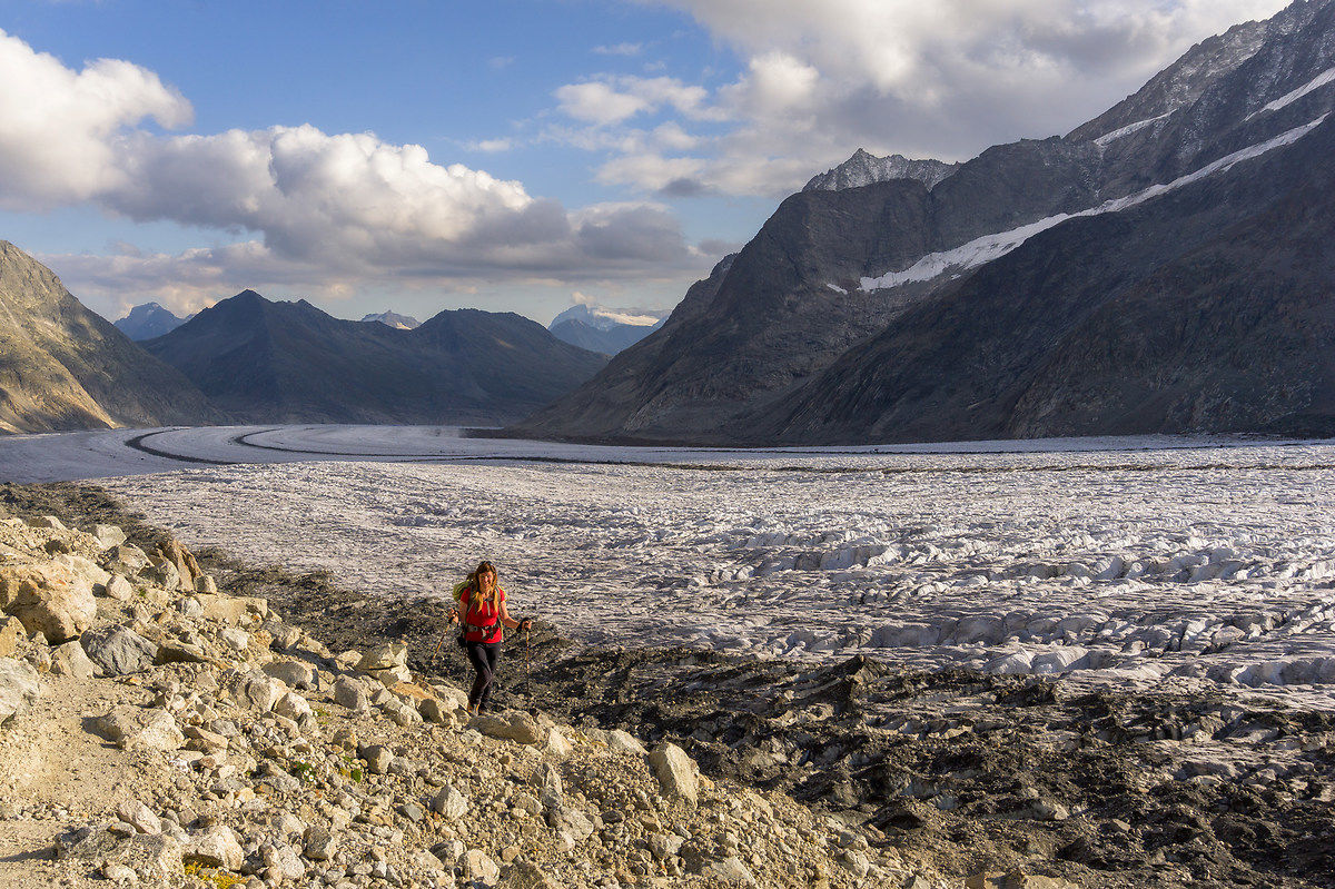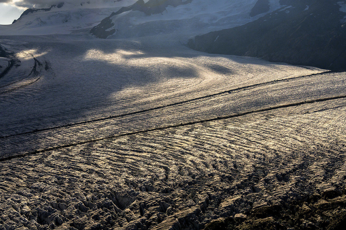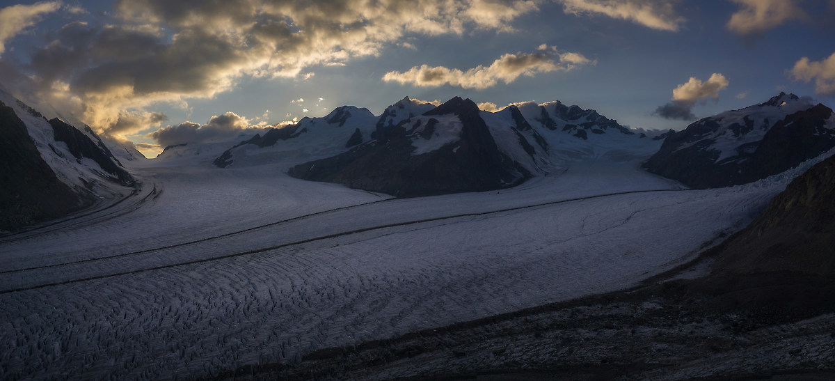 Dopo una quarantina di minuti di sentiero entriamo in una inquietante galleria pedonale lunga un chilometro, che ci proietta in un mondo decisamente più selvaggio e inaspettato. Siamo in vista del gigantesco Aletschgletscher, una lingua di ghiaccio lunga quasi venticinque chilometri e terribilmente larga - la più estesa di tutte le Alpi. Sicuramente una delle "cose" più immense su cui io abbia mai posato lo sguardo, o su cui abbia puntato la macchina fotografica. Lasciamo i sacchi a pelo sotto un grosso masso poco prima di mettere piede sul ghiacciaio, e poi lo percorriamo senza un vero percorso obbligato per svariate ore.