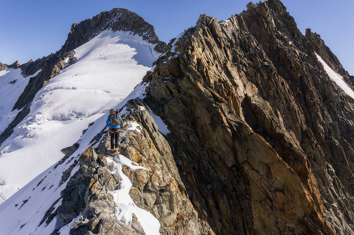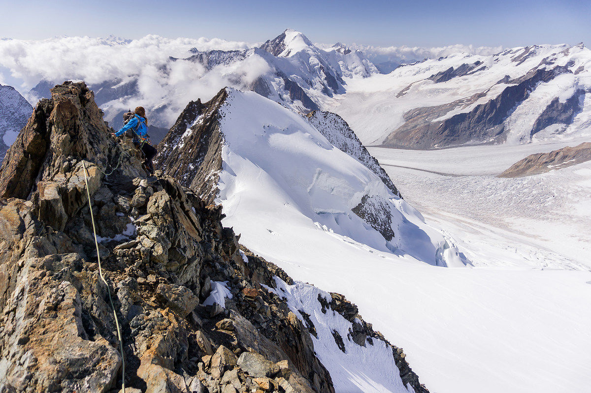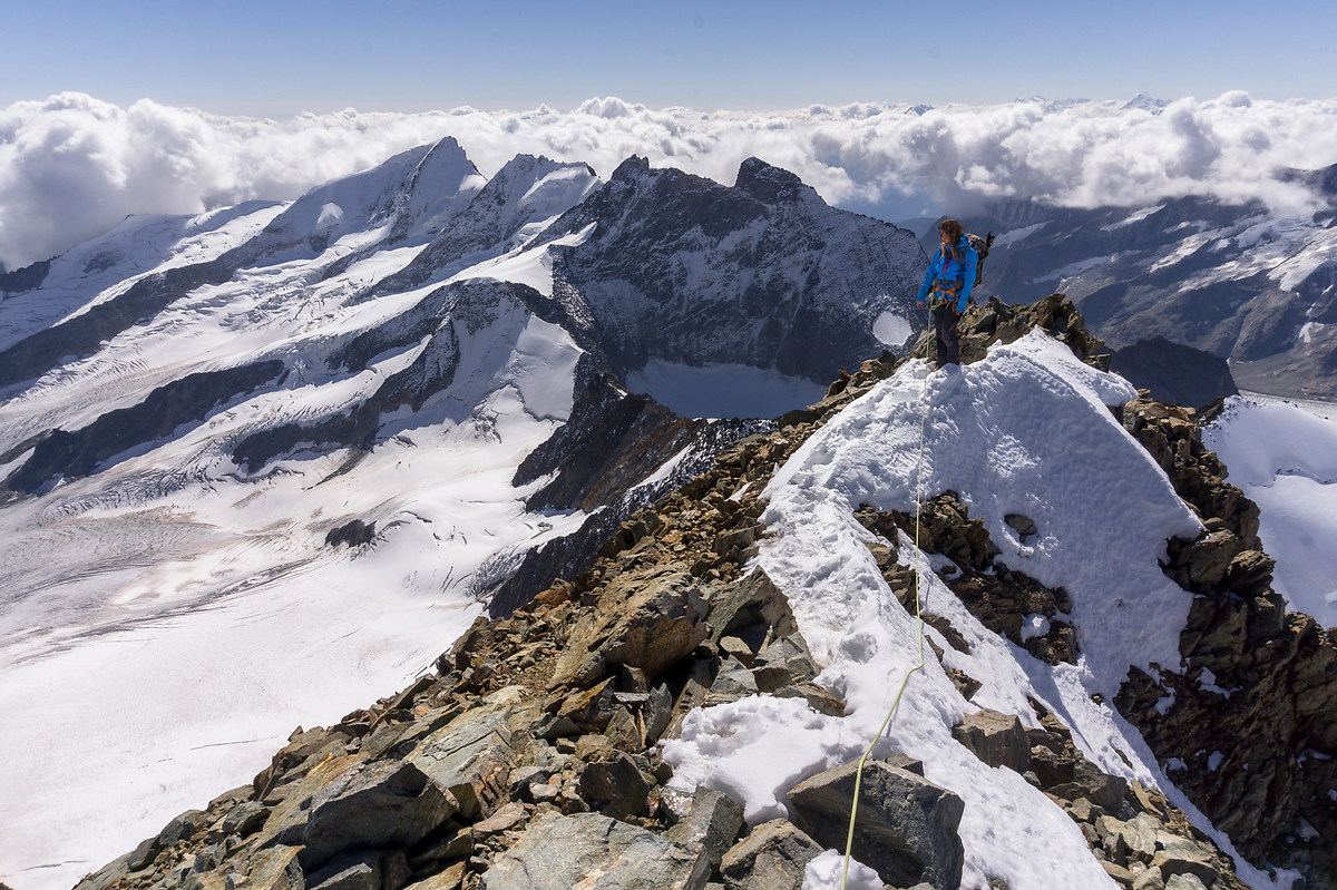 La cresta, inizialmente di roccia, si trasforma in misto nella parte centrale e diviene quasi unicamente nevosa in quella finale. Arriviamo in cima al Grunegghorn, a quota 3860 metri; il panorama è già superbo, la temperatura né troppo alta né troppo bassa. Ma le mie gambe sono infuocate. Da qui dobbiamo ridiscendere per un centinaio di metri dall'altra parte. Decidiamo di fare un ultimo tentativo: Elke sostiene che secondo lei la cresta del Grunhorn è più corta di quanto sembri; a me la cosa convince di meno e con rassegnata onestà le dico che mi sembra più lunga, ripida e faticosa di quanto potessi immaginarmi. Ma ad ogni modo ci proverò, perché ormai siamo qui e dopo un pellegrinaggio così faticoso ci vorrà qualche secolo prima che io torni in questo posto.