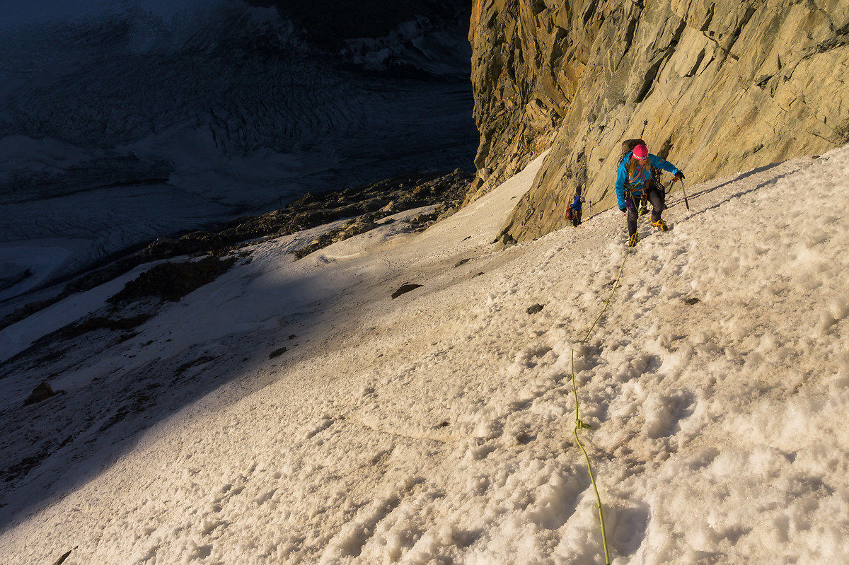 Alle cinque, come previsto, siamo in marcia. E' ancora buio pesto e il termometro del rifugio segna -5°. Camminiamo per un paio di ore lungo una morena detritica, poi superiamo un pezzo di ghiacciaio aggirando qualche crepaccio. Non appena raggiungiamo una zona ancora coperta di neve ci leghiamo e proseguiamo un po' più cauti, ma comunque di buon passo e senza pause.
