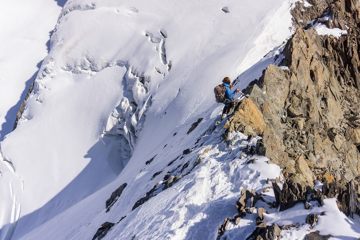 Tutto fila liscio, risaliamo per rocce rotte fino al filo di cresta e togliamo i ramponi per esser più veloci. Saliamo senza soste nemmeno per le foto, passando ogni tanto la corda dietro qualche vago sperone. La cresta si rivela abbastanza facile: una buona notizia finalmente. C'è da stare attenti a molte rocce marce e detriti instabili ma generalmente, stando sul filo, la roccia è abbastanza solida. Alle tredici, dopo aver pestato qualche timida chiazza di neve, siamo in cima ai quattromilaquarantaquattro metri del Gross Grunhorn.