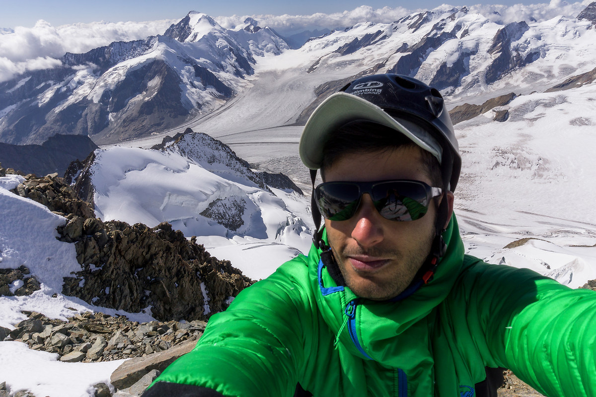 Dieci minuti passano solamente nel fotografare la bellezza estrema di questo luogo. Cerco qualche indizio che possa giustificare il nome della montagna, letteralmente "Gran Corno Verde" (un nome un po' azzardato per una piramide di neve e ghiaccio), ma probabilmente l'unica cosa di questo colore nel raggio di molti chilometri è il mio piumino. Temendo di perdere qualche dettaglio per sempre, scattiamo foto senza pietà in ogni direzione, ripetutamente. Arriviamo alla conclusione che questo è di gran lunga il posto più panoramico e remoto raggiunto fin'ora sulle Alpi da entrambi, e sicuramente anche il più faticoso. Inoltre concludiamo che l'alpinismo è un'attività fantastica, ma solo quando non la stai praticando in un bagno di sudore e brividi, e ti stai godendo le foto di fatiche passate seduto e al caldo. Stiamo in cima una buona mezz'ora senza aver il coraggio di alzarci o pensare alla discesa.