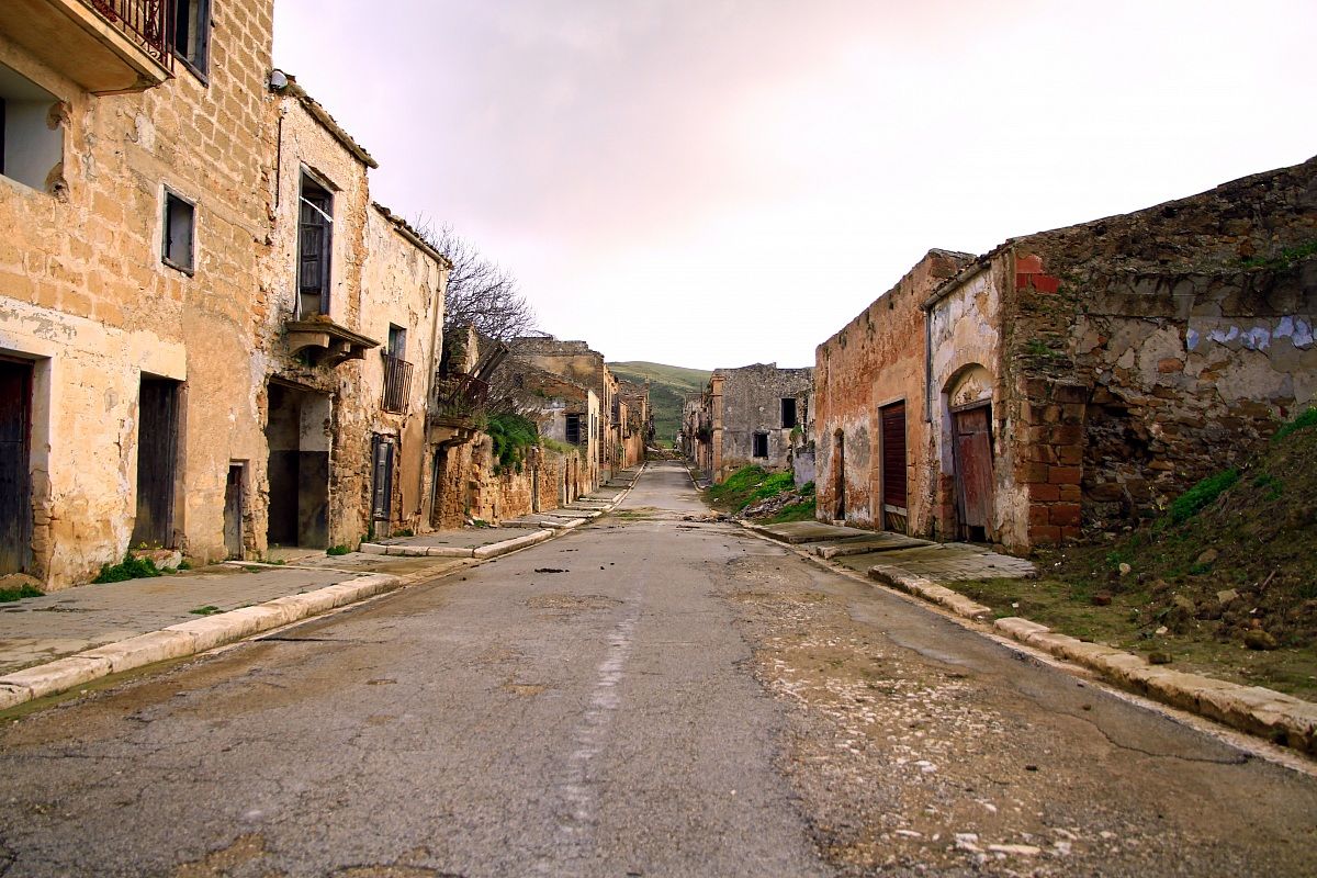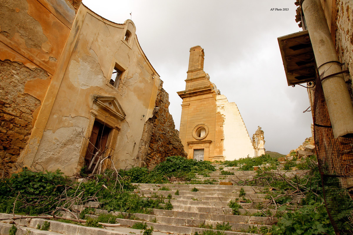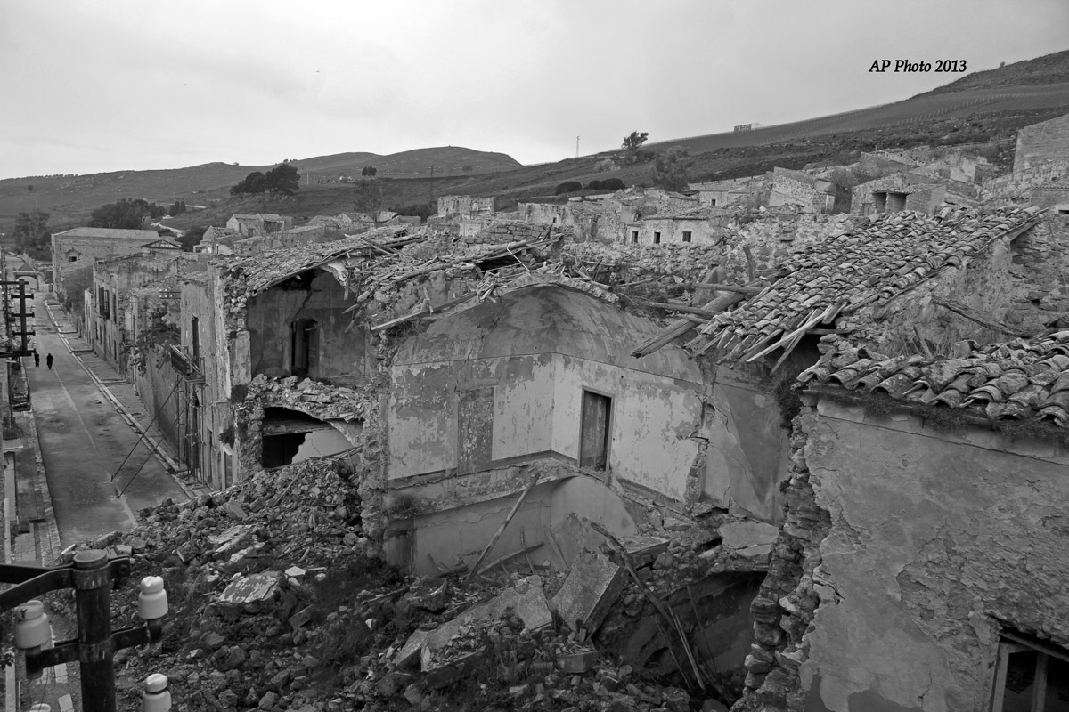 Appena scendo dalla macchina sono investito da un insieme di sensazioni ed emozioni. Il silenzio che avvolge quel posto è nuovo per me ,nessuno di noi è più abituato al silenzio, quello vero, al silenzio che qui è simbolo dell'abbandono e del dolore di questa terra. E poi c'è quella sensazione di immobilità, tutto è fermo immutato così dal 1968! Dopo pochi passi all'interno del paese faccio un primo scatto per tradurre in immagine l'insieme di tutte queste sensazioni, una foto che ritrae il viale principale con le file di case da una parte e dall'altra che si susseguono in rovina.