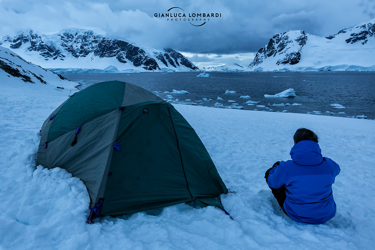 Nonostante fossimo di notte, la luce del crepuscolo era forte e illuminava le montagne della Costa di Danco sulla Penisola Antartica. Per fortuna, inizialmente i venti hanno dato tregua, permettendo di montare le tende senza troppe difficoltà. La normativa IAATO vieta agli umani di lasciare le proprie deiezioni durante gli sbarchi, per cui ad un centinaio di metri dall'accampamento avevamo allestito la latrina portatile da campo (in realtà null'altro che un bidone denominato Mr. Yum-Yum, ricoperto da un telone di plastica rinforzata, ed infilato per metà in un buco nella neve). Viene da ridere a pensare di fare la pipì da seduti su Mr. Yum-Yum con la temperatura a -15 gradi? A farla davvero la pipì, poi la voglia di ridere passava. Anche perché il barometro stava scendendo rapidamente, il vento cominciava ad aumentare in modo consistente, e la sensazione termica era notevolmente più fredda che durante la giornata.