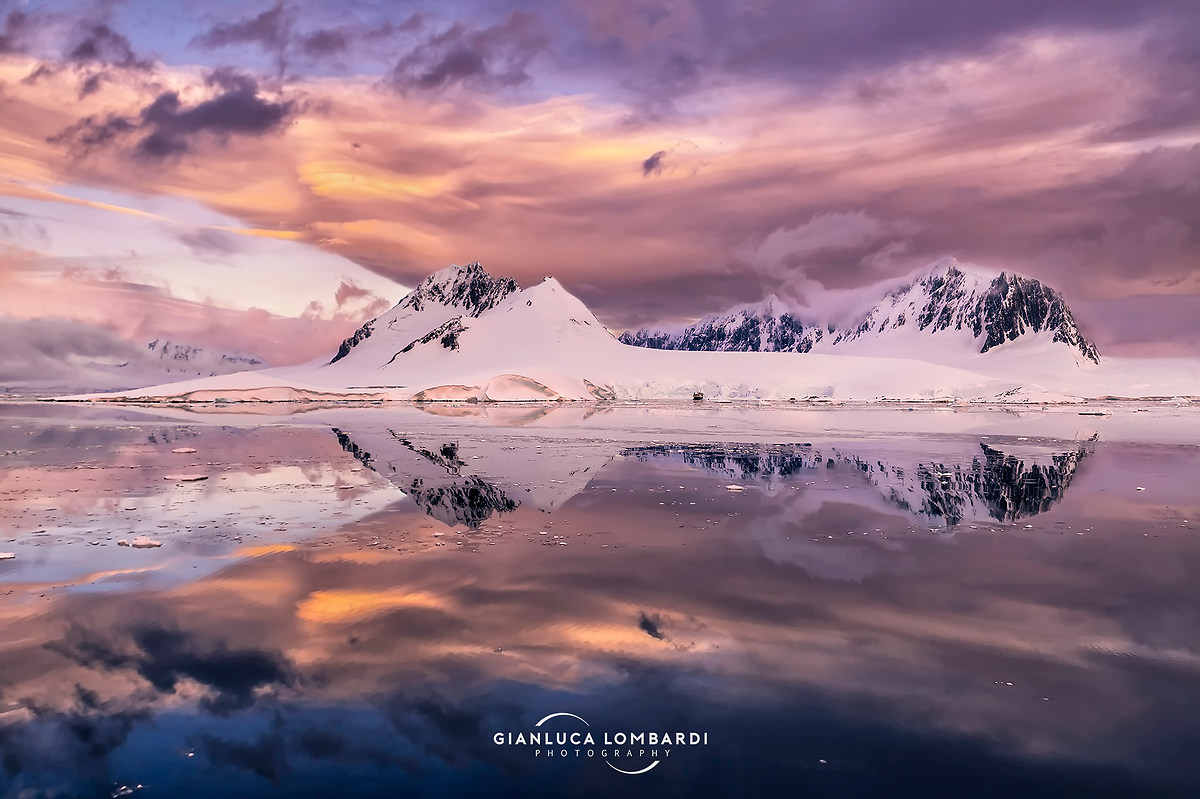 Poche volte si lascia un pezzo di cuore in un posto. Durante questo viaggio credevo di averlo lasciato già altrove nei giorni precedenti, in almeno altri tre o quattro luoghi. Ma non ero preparato al tramonto del 24 Novembre a Wiencke Island. Dopo aver lasciato Waddington Bay, la nave ha ripercorso a ritroso il Canale di Lemaire, facendo rotta verso Port Lockroy. Wiencke Island è la più meridionale delle isole dell'Arcipelago di Palmer, tra Anverse Island e la costa occidentale della Penisola Antartica. Col passare dei giorni ho imparato la mutevolezza estrema del clima sulla costa, dai venti catabatici alla calma piatta, dal Sole splendente alle nuvole a piombo, tutto in questione di pochi minuti. All'ingresso del Canale Neumayer le nuvole compatte hanno iniziato a lasciar passare qualche timido raggio di Sole. Il vento ha istantaneamente smesso di soffiare al livello del mare, ma probabilmente ha iniziato a soffiare fortemente in quota, cominciando a spazzare le nubi e lasciando un misto di nuvole lenticolari sulle montagne del Fief Range dell'isola, mentre il mare era totalmente immobile, creando una superficie a specchio sulla quale sembrava di essere sospesi nel vuoto, in un silenzio surreale. Il Sole era radente, e le nuvole lenticolari hanno cominciato ad accendersi dei colori del tramonto. Sembra pazzesco, ma eravamo solo in quattro o cinque persone in quel momento sulla prua della nave, non ho idea di dove fossero gli altri. In un silenzio assoluto, questa scena sconvolgente è durata quasi un'ora, dal tramonto all'ora blu, in uno scompiglio di incredulità, una cartolina oltre ogni possibile fantasia o immaginazione, dipinta da Madre Natura in persona.