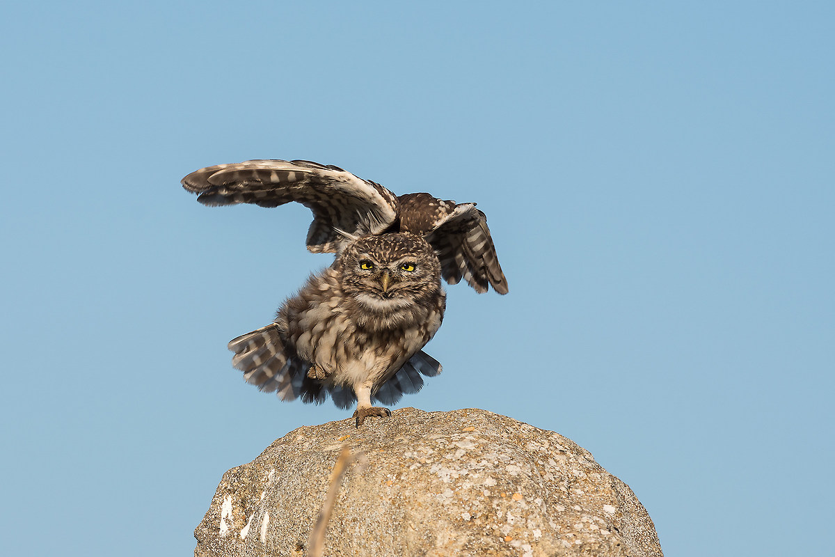 Ok, it's time to go home, but the owls are still in the nest, or in the perch, so what have I to do? Nothing, you have to do!! Yes, the only chance for not scaring the little owls is waiting until they go away. Maybe they'll so in the nest, or they'll fly somewhere, you can't know it, but that is the right moment. Sometimes happens that a predator, like a buzzard or a marsh harrier, fly above frightening them and to stay safe they might go in the nest, as usual. So if you want to go away is the right moment. You would have to leave the blind quickly. If you are using a fixed blind, won't be a problem storing the camera in the backpack, differently with a portable photo blind you'll need to dismount everything, and it will take more time, so being fast is essential. Of course, there is the chance that the little owls go naturally somewhere, and if after some minute they don't get back, so you can leave the spot quietly.