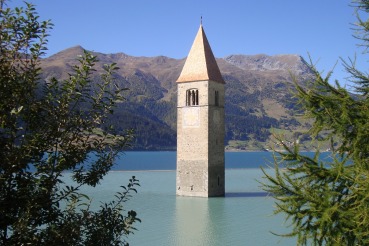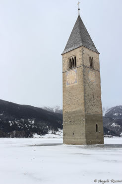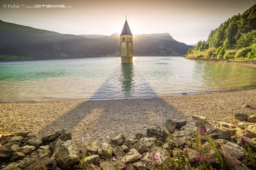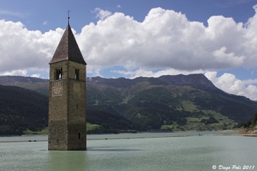 Soggetti : Paesaggio, campanile, lago, serfisti, gruppo dell'Ortles, Vallelunga, Bovini HIGHLANDER (Razza bovina scozzese), Resia, Passo Resia, Nauders, Laghi Verde e Nero, Tre Confini, Tre Laghi, cimitero di guerra