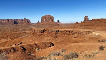 Note : Il territorio è prevalentemente pianeggiante ad eccezione delle celeberrime formazioni rocciose dette butte o mesas, sfondo di moltissimi film western come il celebre Ombre Rosse di John Ford, fumetti come Tex, pubblicità. Se il buon tempo vi accompagna, da non perdere è il tramonto, altrimenti preferite il mezzogiorno. Sosta di rito nella Monument Valley è il mitico Goulding's Lodge, dove si fermavano John Wayne e gli altri grandi dei film western; potrete vedere la cabin dove alloggiava proprio John Wayne e naturalmente vi è anche un negozio di souvenir e un piccolo museo di vita western e di cinema, tutto gestito dai nativi americani.