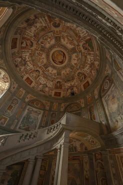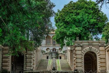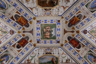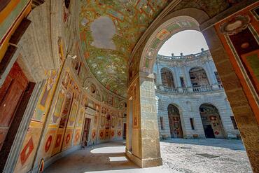 Note : Dimora signorile costruita dai Farnese nel piccolo Comune di Caprarola (VT) a nord di Roma.Il Palazzo, con architettura Rinascimentale a pianta Pentagonale, fu iniziato da Antonio da Sangallo il Giovane nel 1530.Alla morte del Sangallo (1546), i lavori furono ripresi dal Vignola il quale modificò profondamente il primitivo progetto e terminò i lavori nel 1575.Il Palazzo divenne in seguito la residenza estiva del Cardinale Farnese con tutto il suo seguito.Gli spazi interni sono completamente affrescati ad opera dei migliori pittori ed artisti del tempo. Da ricordare: i fratelli Taddeo e Federico Zuccari, Onofrio Panvinio, Fulvio Ortini, Giovanni de Vecchi, ecc.Meritevole di particolare attenzione la scalinata a chiocciola che porta ai piani superiori (Scala Regia), la sala del Mappamondo, la Camera dell'Aurora, La Stanza dei Fasti Farnesiani e gli Orti Farnesiani.