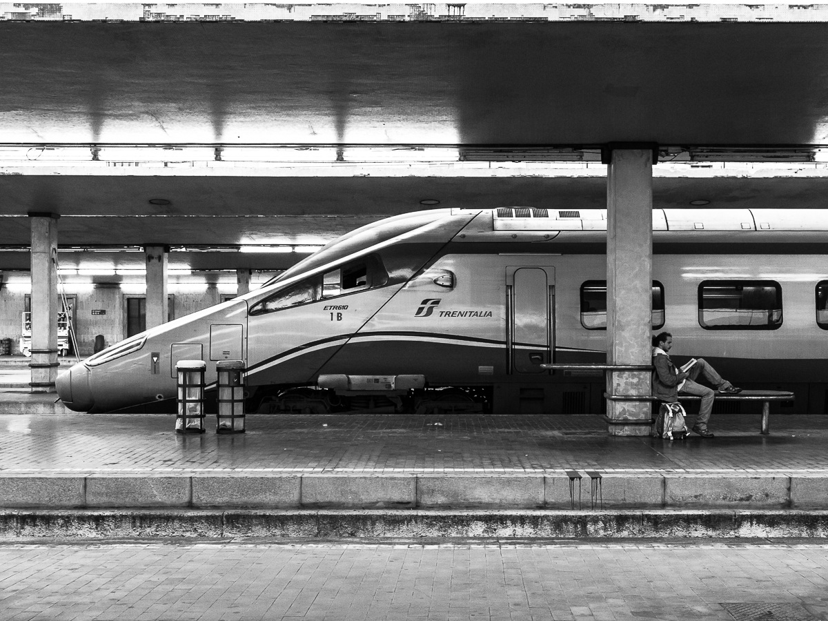 I was drawn to, perhaps more simply, from the position of the leg of the boy, the one whose flexed foot rests on the bench, as it is similar to the corner that form the "face" of the train. From this reasoning was born the title <---->