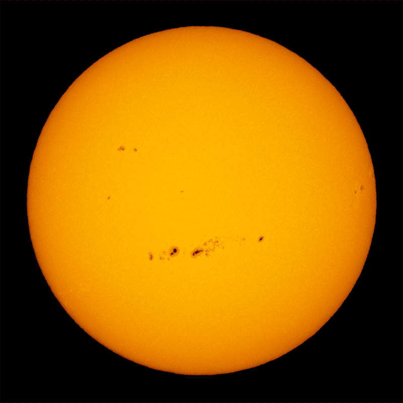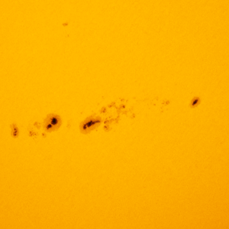 Non ci speravo più di riuscire a riprenderla, in quanto qui da me sono almeno 4-5 giorni che c'è un tempo pessimo! ed invece questa sera, approfittando di qualche schiarita sono riuscito finalmente a fotografare il famoso gruppo di macchie solari e perfettamente in centro al disco solare!