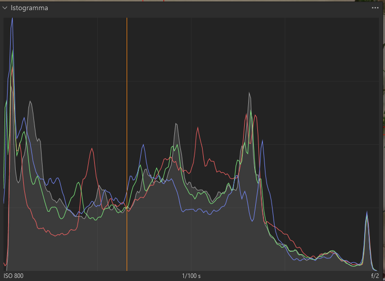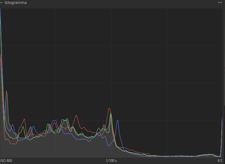 Fuori gara Seguono note: preliminare: DxO Pure Raw 5 ==> DeepPrime XD2s, Luminance 40 , Force Details 0, Vignetting, Chromatic aberration, Lens distortion, Lens Sharpness optimization: Intensity 100. Post: Capture One 16.7.6 (Windows). Caratteristiche di base , Curva : Auto. Punto chiave: Verticale -6,62 Orizzontale -9,19 Inclina 1,52 Nitidezza: Quantità da 240 (nativo) a 51 Raggio da 1,2 (nativo) a 0,5 Questi due parametri hanno contribuito a ridurre gli spikes nei pixel originariamente non sovraesposti ma fuori gamut. Alte Luci -53 Bianco -49 Ombre 11 Nero 7 Valori Tonali: RGB In output da 255 a 244; da 0 a 7. Curva: RGB Preset: Contrast RGB Luminosità : 21 preservando la saturazione. Tre maschere localizzate 1) sul tappeto e sul pavimento (in legno) : aumento della saturazione 10; 2) Viso e pelle dei soggetti in primo piano: Con parametri scelti per riportare i toni di pelle dei soggetti in primo piano a valori L*a*b* canonici. 3) Cappotto in verde scuro del soggetto giovane in primo piano Nient'altro.!!!! Istogramma prima :