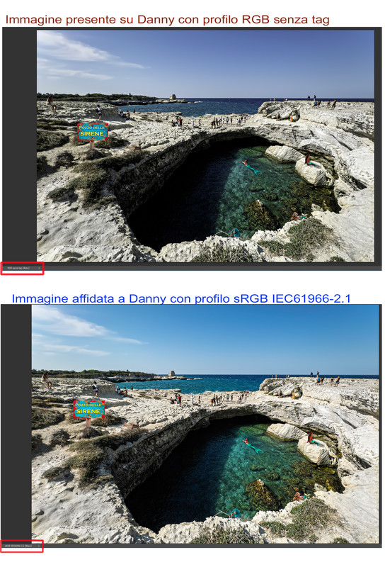 Quindi ho scaricato la mia post da Danny e confrontato con quella che avevo inserito; di seguito metto il confronto dove si nota la diversità e metto in evidenza che mentre la mia è con profilo sRGB IEC61996-2.1, quella presente su Danny è con profilo RGB senza tag.