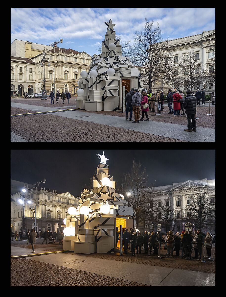 Piazza della Scala. Domenica 2 gennaio 2022, 15:44. Qui è visibile la porta d'uscita dell'installazione, posta sul lato opposto rispetto all'ingresso. Sulla sfondo a sinistra è il Palazzo Marino; a destra il portale della Galleria Vittorio Emanuele II. #UrbanLife #Natale #Christmas