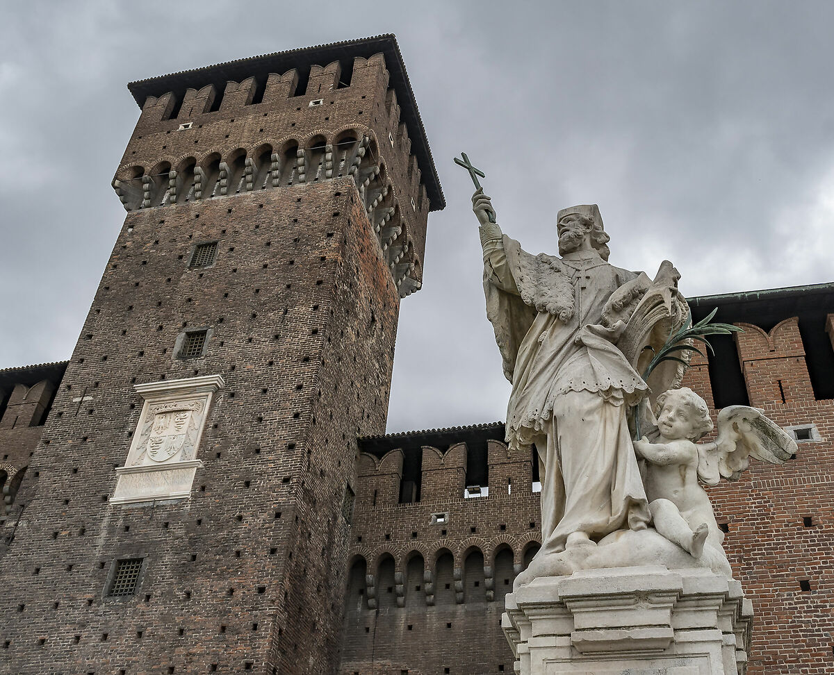 Cortile delle Armi del Castello Sforzesco. Giovedì 7 agosto 2025, 11:51. San Giovanni Nepomuceno è un santo boemo e fu protettore degli eserciti austriaci. Tale statua venne commissionata nel 1727 a Giovanni Dugnani e costituisce una testimonianza storica nel Castello della dominazione absburgica. L'angioletto ai piedi del santo regge una palma del martirio. La Torre di Bona risale alla seconda metà del '400 e il suo attuale aspetto è dovuto al radicale restauro, effettuato nell'ultimo decennio dell'800, dall'architetto Luca Beltrami, che ne ricostruì la parte alta e le merlate. Si vedano le foto e i link nel primo post dei commenti qui sotto. #Castello #Torre #Monumenti #Statua