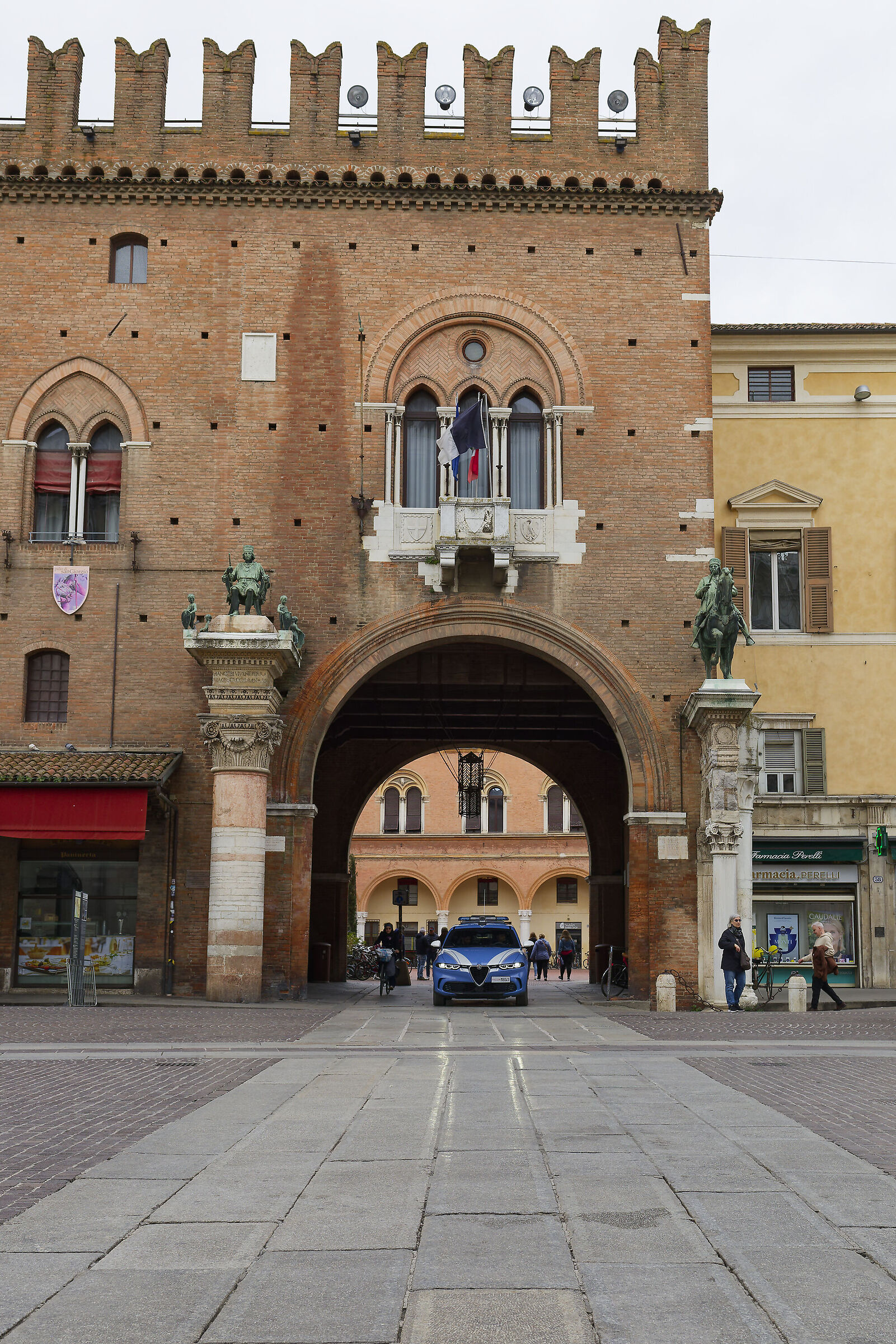 Palazzo Ducale: Originariamente era la residenza della famiglia Este, prima del trasferimento al Castello. La facciata attuale è in stile neogotico, risalente agli anni '20 del Novecento. L'arco conduce al cortile interno, un tempo giardino segreto e ora piazza centrale. Ai lati dell'arco si trovano le colonne con le statue dei primi duchi estensi, Nicolò III e Borso.