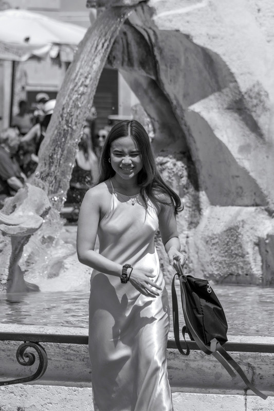 Two splendid portraits, both in BN and in color; I am struck by the contrast between the sports shoes and the long and elegant dress... I would have seen a 12 heel better! ;-) ... but I'm old-fashioned... :-D