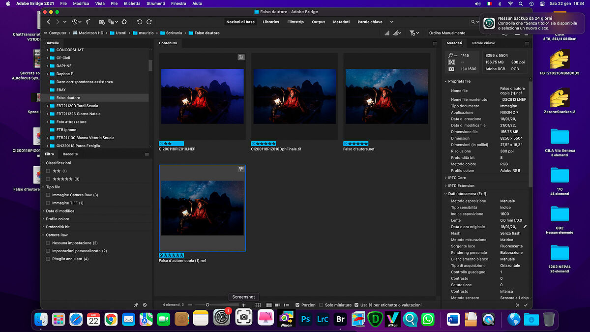 schermata dal mio pc, appena fatta. Adobe bridge il primo file è il nef originale; il secondo file è il tiff post prodotto, il terzo file è il nef originale modificato, il quarto file è il nef originale modificato e aperto ed elaborato in camera raw . Questo significa che un tiff elaborato può essere salvato in raw e riaperto successivamente in camera raw come un file raw originale. Non escludo, ovviamente, che un esperto di informatica possa accorgersi della modifica del file originale, ma il solo possesso del nef non garantisce la genuità del suo relativo nef. Questo con buona pace di tutti quelli che sostengono il contrario. P:S.: E' bene precisare che io ho riprodotto il raw/nef nativo, appositamente rinominato, di una foto già elaborata e in cui è stato sostituito il cielo, di una foto cioè "taroccata". Non ho perso tempo a taroccare il nef stesso e cioè a inserire il nome originale, ridimensionare le dimensioni, cambiare l'orario di scatto, ec.ec., tutti operazioni facilmente eseguibili da un buon informatico in quanto, ovviamente, non avevo intenzione di ingannare alcuno. |