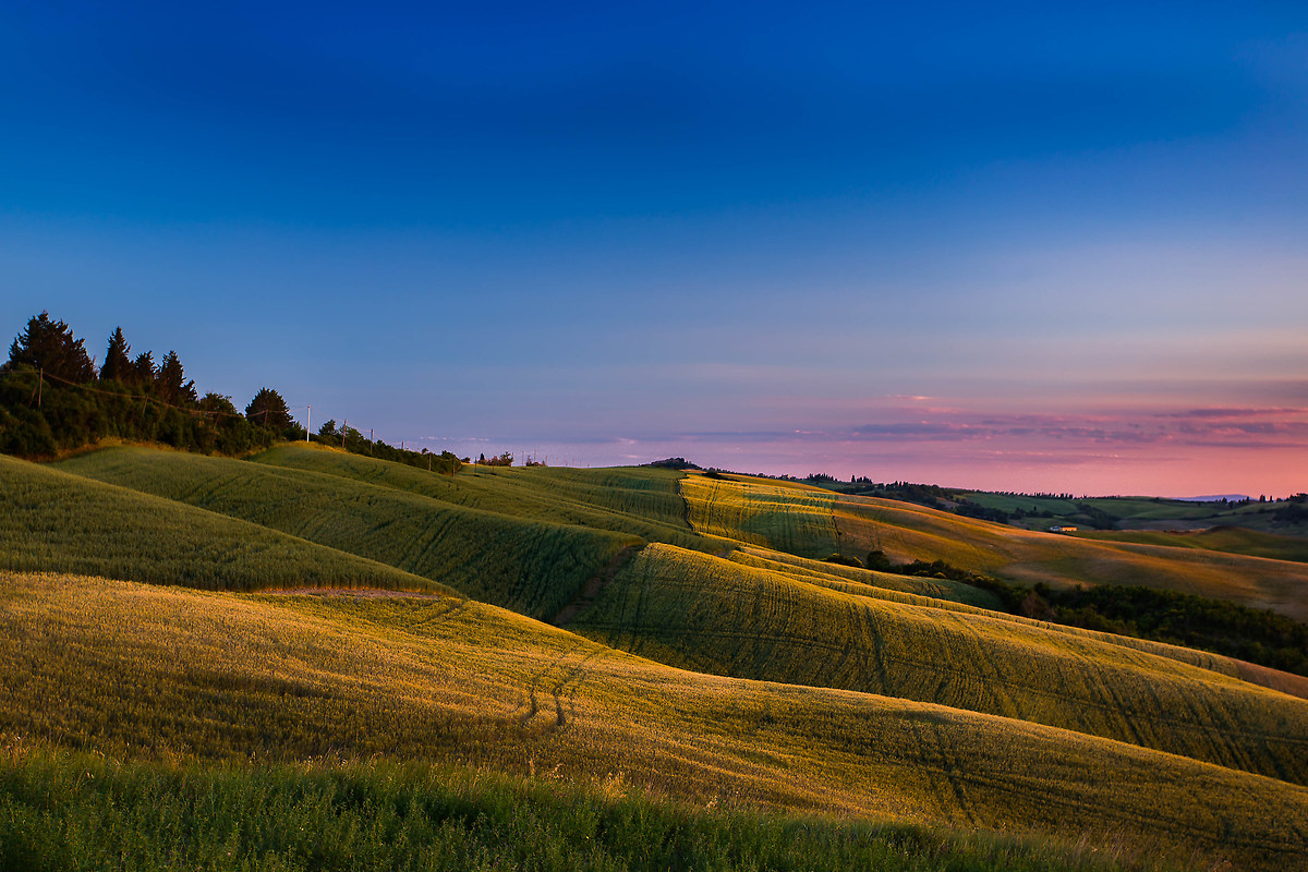 Bellissimi i colori e le linee delle colline. L'avrei vista ancora più minimal tagliando gli alberi sulla sinistra e parte dell'erba in basso. I riflessi della luce sulle curve delle colline sono fantastici e li avrei esaltati al massimo facendone il solosoggetto. |
