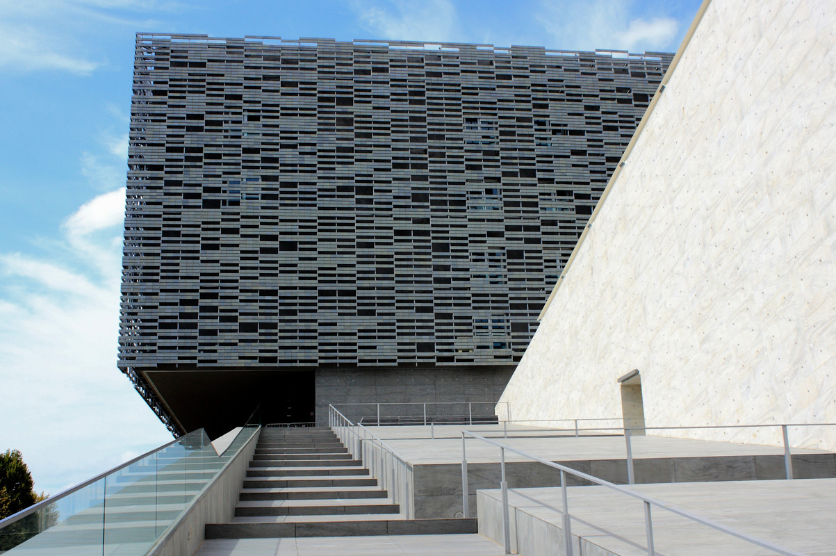 Prima di entrare nella parte superiore della struttura a cielo aperto, queste immagini si soffermano sull'architettura della scalinata piccola e della parte superiore con il volume parallelepipedo della torre scenica con la parete a listelli di «cotto» della torre scenica stessa.