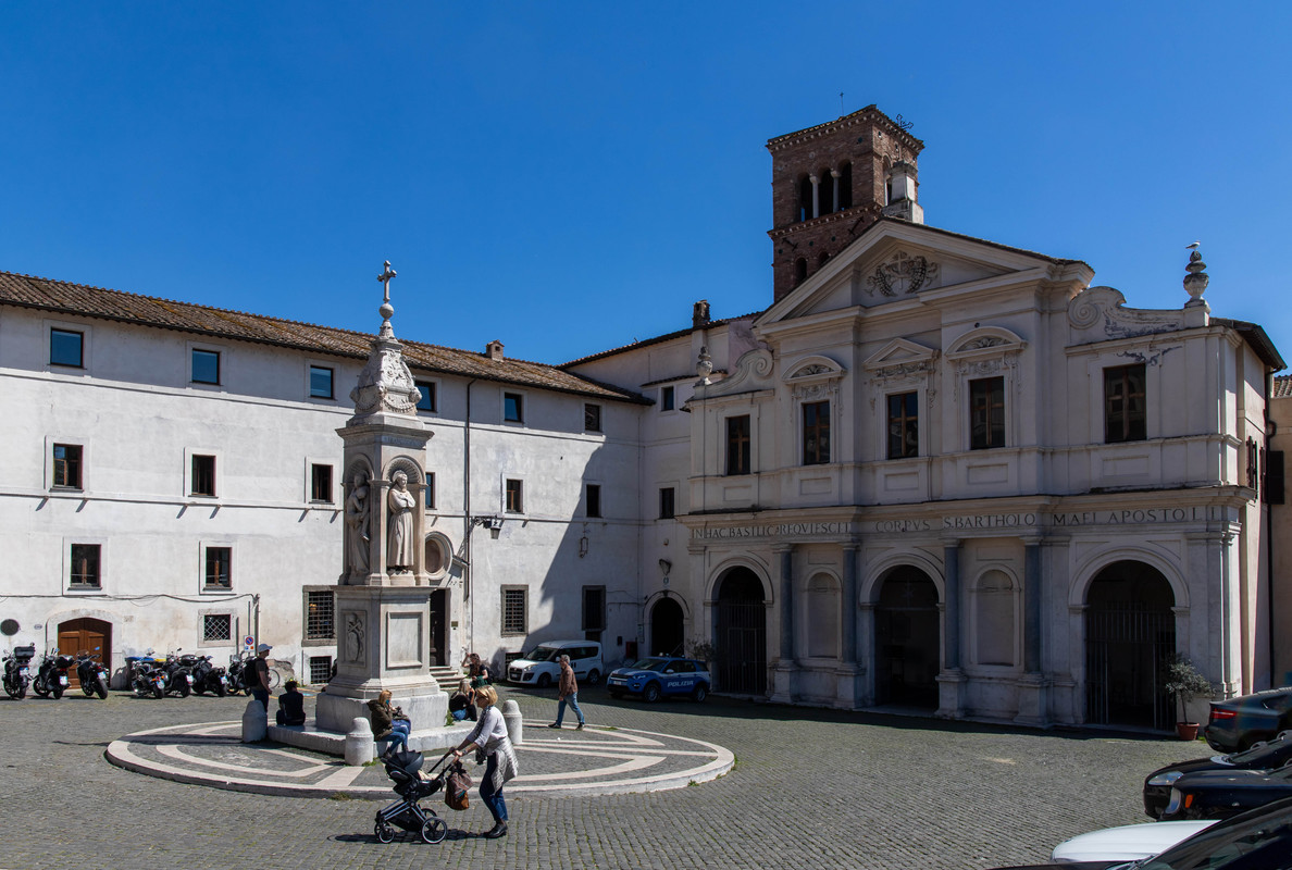 La chiesa fu costruita nell'anno 998 sull'Isola Tiberina per contenere le reliquie di san Bartolomeo apostolo; ha la dignità di basilica minore. Bartolomeo, uno dei dodici apostoli di Gesù, è una figura di cui si conosce relativamente poco, ma che è ancora oggi profondamente venerata nella tradizione cristiana. Si ritiene che fosse presente al primo miracolo compiuto da Gesù, la trasformazione dell'acqua in vino durante le nozze di Cana. La morte di san Bartolomeo (apostolo) è legata alla tradizione che lo vede scuoiato vivo. Altre fonti, invece, si riferiscono alla "Notte di san Bartolomeo", un massacro di ugonotti avvenuto a Parigi tra il 23 e il 24 agosto 1572.