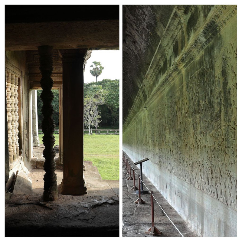 Colonne scolpite e bassorilievi nelle lunghe gallerie.