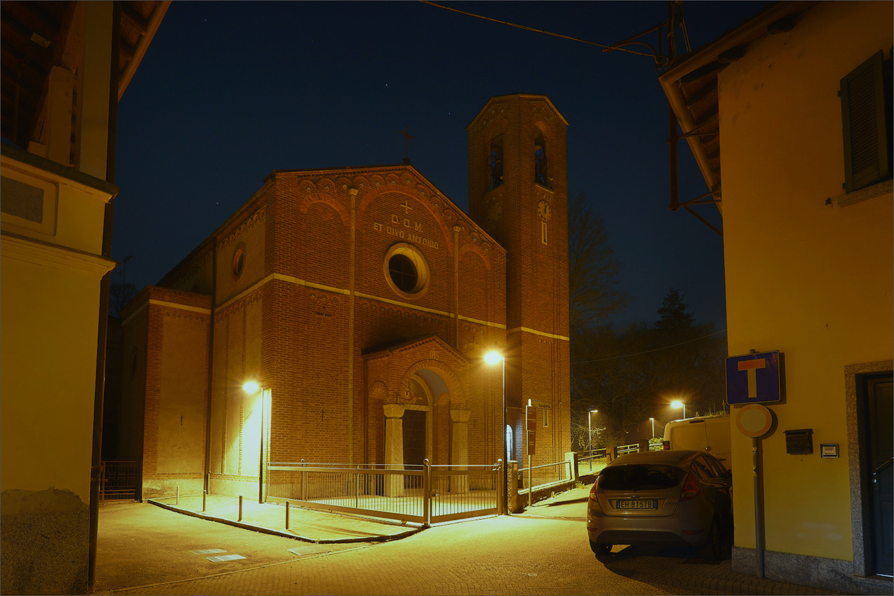 2023-03-20, ore 22.34. la chiesa si trova a pochi metri dal fiume Lambro in localitá Ponte, in via Gaetano Casati a Triuggio (MB)
