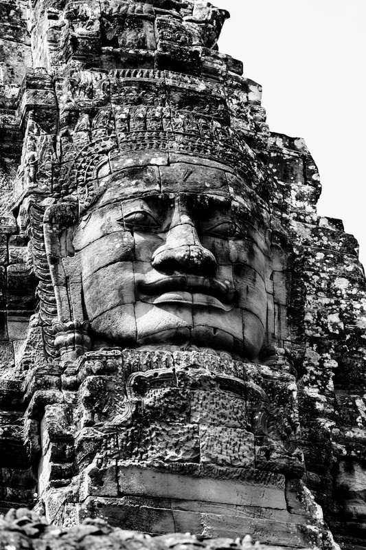 L'immagine mostra uno dei volti in pietra del tempio di Bayon, situato all'interno della città murata di Angkor Thom in Cambogia. Il tempio è famoso per le sue serene e massicce facce di pietra intagliate nelle torri, che rappresentano il Bodhisattva Avalokiteshvara, ritenuto somigliante al re Jayavarman VII, che commissionò il tempio alla fine del XII o all'inizio del XIII secolo.
