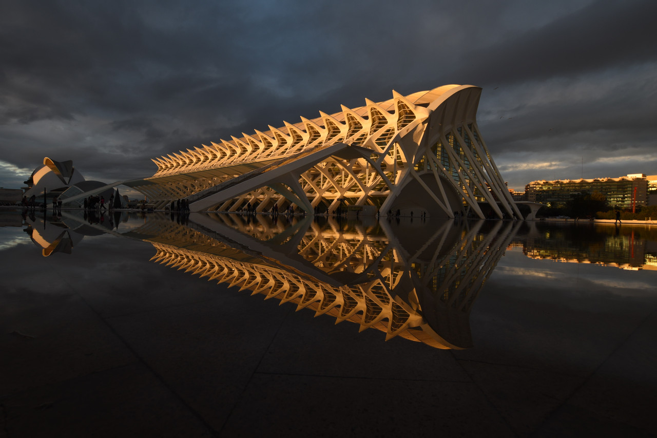 Bello scatto. Mi sembra doveroso scrivere, per chi non conosca questa struttura, che si tratta del Museo della Scienza di Valencia, progettato da Santiago Calatrava, architetto e ingegnere di fama mondiale, nato per l'appunto a Valencia. Sono molto belle entrambe le versioni, ma preferisco quella in bianco e nero, sarà anche perché hai curato di più la post-produzione facendo emergere le ombre, e soprattutto emerge maggiormente la bellezza della struttura, che richiama, come in molte architetture di Calatrava, una struttura biologica, vale a dire un'enorme colonna vertebrale di un fantastico animale. Complimenti e un saluto. |