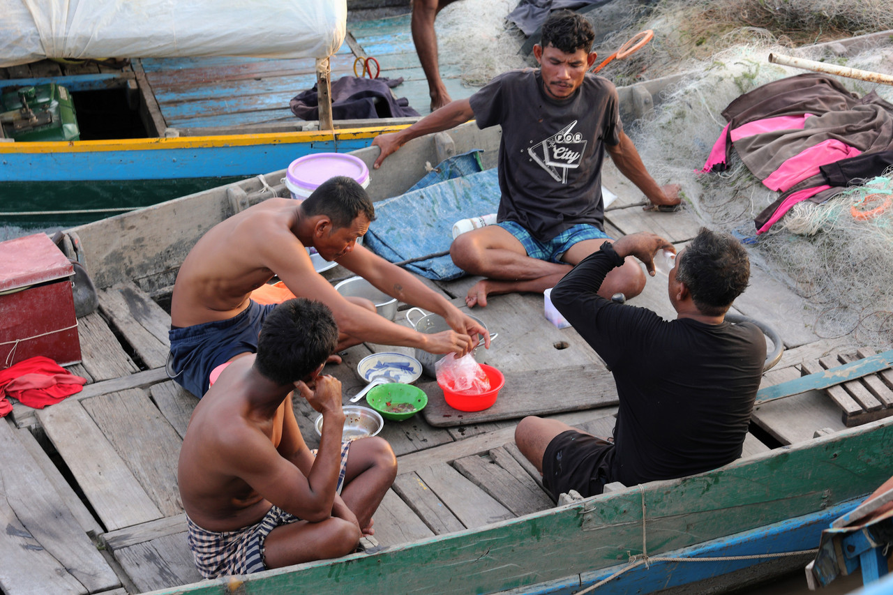 I pescatori sono seduti a terra sul ponte della barca, circondati da reti da pesca e attrezzature, condividendo il pasto assieme al nostro pilota.